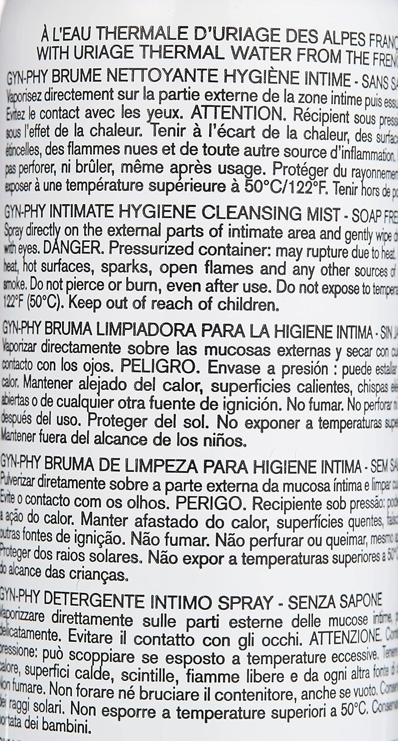 Uriage Gyn Phy Refreshing Intimate Hygiene Mist is designed for daily use, offering gentle cleansing and hydration for sensitive intimate areas. Its soap-free formula is tested under gynecological control, ensuring comfort and safety. Features Suitable for sensitive intimate area Soap-free Physiological pH (5.5) Gently cleanses Refreshes & hydrates Soothes sensations of discomfort Daily use Rinse-free Hypoallergenic Key Ingredients: Water, Uriage Thermal Water, Glycols, Lactic Acid (pH balancer), Mild Surfactants, Fragrance.Uriage: Experts in thermal skincare solutions, offering gentle and effective products for sensitive skin.Apply As Needed To The Intimate Area. No Rinsing Required.For external use only. Avoid contact with eyes. Discontinue use if irritation occurs.