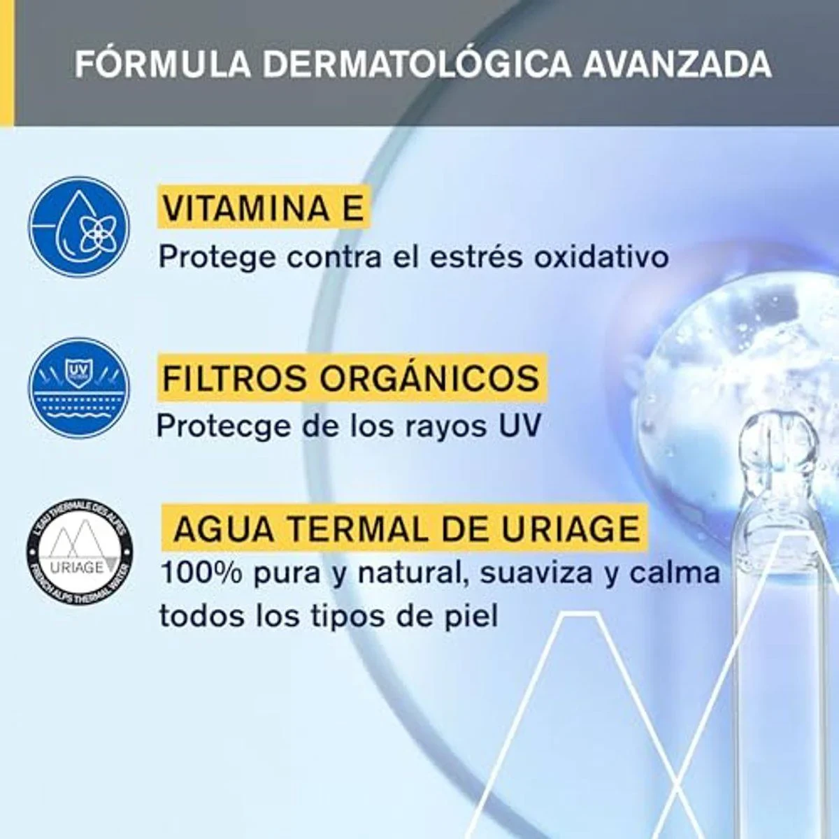 Uvinul A Plus, Uvinul T 150, Avobenzone, Tinosorb S, Aquaspongines, Uriage Thermal Water, Vitamins C and E, Dicaprylyl Carbonate, Isohexadecane, Diethylamino Hydroxybenzoyl Hexyl Benzoate, Ethylhexyl Methoxycinnamate, Butyl Methoxydibenzoylmethane, Ethylhexyl Salicylate, Ethylhexyl Triazone, Bis-Methoxyphenyl Ethylhexoxyphenol Triazine, Hydrogenated Polydecene, Parfum (Fragrance), Tocopheryl Acetate, Tocopherol, Ascorbyl Tetraisopalmitate, BHT.Uriage: Dermatological skincare brand known for its thermal water-based products, offering solutions for sensitive skin.Apply a generous and even layer on the body and hair 30 minutes before sun exposure. Reapply frequently, especially after sweating, swimming, or towel-drying.Keep babies and young children away from direct sunlight.