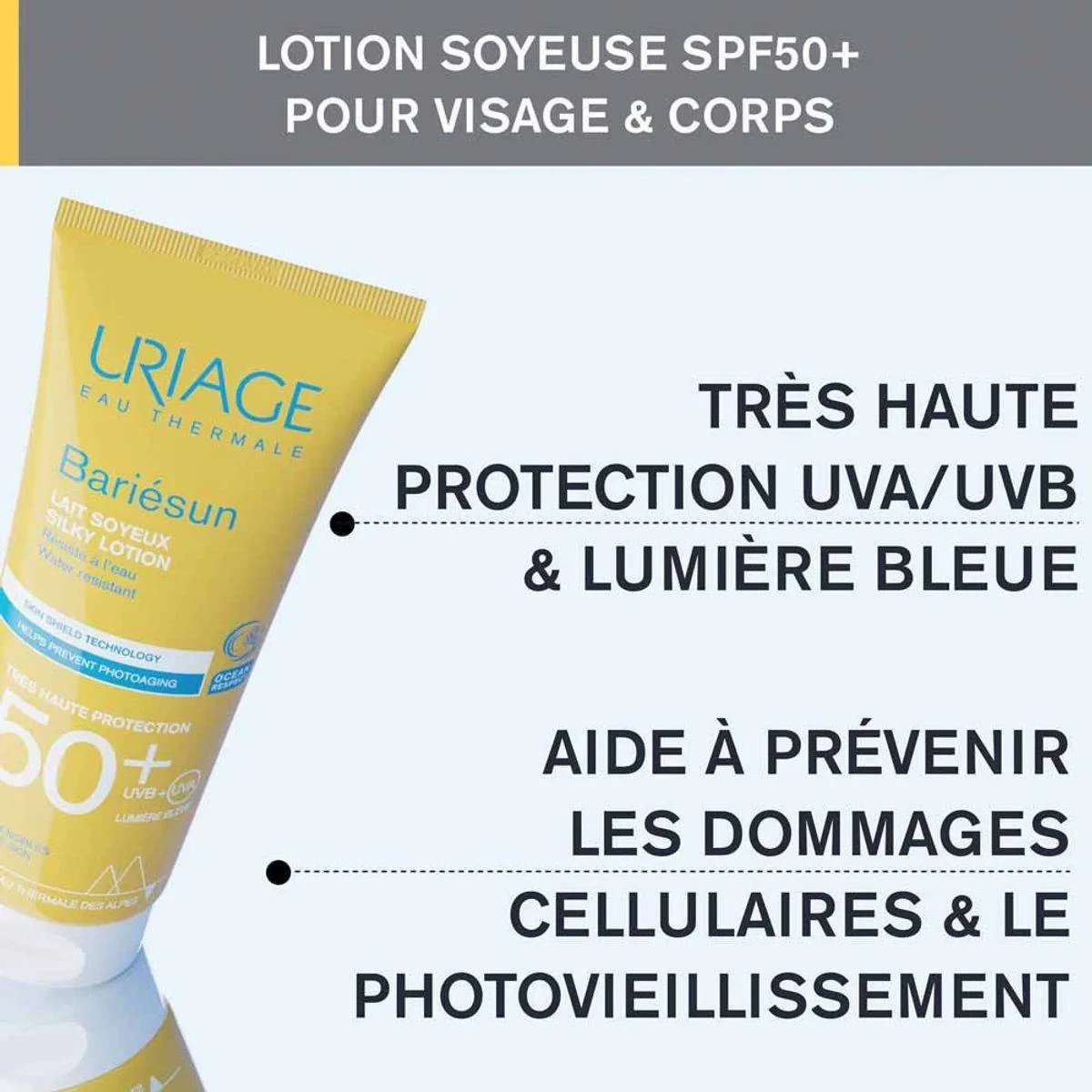 Uriage Bariesun Moisturizing Lotion SPF50+ offers high sun protection with a silky finish. Enriched with Uriage Thermal Water, it hydrates and protects sensitive skin against UVA, UVB, and blue light. Ideal for daily use, it is non-comedogenic and water-resistant. Key Features Very high SPF50+ sun protection Moisturizes and protects skin with Uriage Thermal Water Broad-spectrum UVA and UVB protection Fights free radicals Prevents skin dryness Waterproof Light, non-greasy texture Safe for sensitive skin Hypoallergenic Fragrance-free Aqua (Water), Dicaprylyl Carbonate, Uriage Thermal Spring Water, Methylene Bis-Benzotriazolyl Tetramethylbutylphenol [Nano], Butyl Methoxydibenzoylmethane, Ethylhexyl Triazone, Bis-Ethylhexyloxyphenol Methoxyphenyl Triazine, Glycerin, Diisopropyl Adipate, Diethylamino Hydroxybenzoyl Hexyl Benzoate, C12-15 Alkyl Benzoate, Diisopropyl Sebacate, Ethylhexyl Triazone, Diethylhexyl Butamido Triazone, Water [Aqua], Propylene Glycol, Silica, Decyl Glucoside, Acrylates Copolymer, Butylene Glycol, Caprylic/capric Triglyceride, Glyceryl Stearate, Ceteareth-33, Sodium Polyacrylate, 1,2-Hexanediol, Caprylyl Glycol, Parfum (Fragrance), Xanthan Gum, Tocopheryl Acetate, Gluconolactone, Sodium Benzoate, Sodium Hydroxide, Citric Acid, Ascorbyl Tetraisopalmitate, Tocopherol, Parfum (Fragrance), Lactic Acid, Phenoxyethanol, Ethylhexylglycerin, Sodium Chloride, Sodium Benzoate, Potassium Sorbate, Sodium Hydroxide, Disodium EDTA, Citric Acid, Sodium Hydroxide, Tocopherol, Ascorbyl Palmitate, Lecithin, Ascorbyl Palmitate, Hydrogenated Palm Glycerides Citrate, Lecithin, Tocopherol, Ascorbyl Palmitate, Citric Acid, Ascorbyl Tetraisopalmitate, Sodium Hydroxide, Parfum (Fragrance), Limonene, Linalool, Citronellol, Geraniol, Citral, Benzyl Alcohol, Benzyl Salicylate, Benzyl Benzoate, Coumarin, Eugenol, Hexyl Cinnamal, Butylphenyl Methylpropional, Hydroxycitronellal, Alpha-isomethyl Ionone, Benzyl Salicylate, Benzyl Benzoate, Benzyl Cinnamate, Citronellol, Geraniol, Citral, Limonene, Parfum (Fragrance).Uriage: Dermatological skincare solutions with thermal water from the French Alps, known for sensitive skin care.Apply a generous amount before sun exposure. Reapply frequently, especially after swimming, sweating, or towel drying.Apply the lotion to the entire face and neck before sun exposure. Reapply after each bath, perspiration, or towel drying. Avoid direct sun exposure for babies and young children.