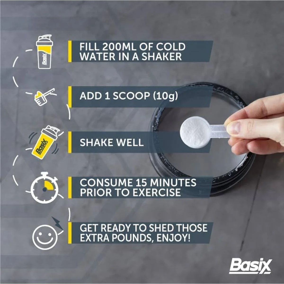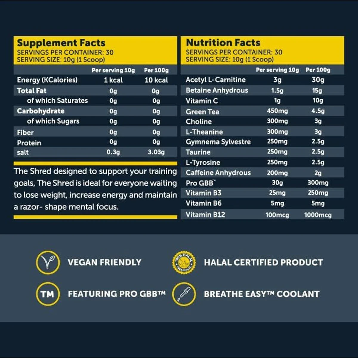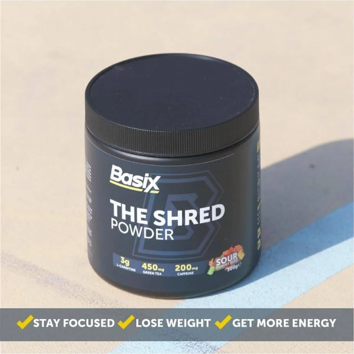 Basix The Shred Sour Gummy Bear is a thermogenic fat burner designed to aid weight loss when combined with a healthy diet and exercise. It contains 200 mg of caffeine to boost energy and metabolism, and includes l-carnitine, green tea, choline, l-tyrosine, and B-Vitamins for muscle recovery and definition. Key Features Aids in weight loss with diet and exercise Contains 200 mg caffeine for energy Includes l-carnitine, green tea, choline, l-tyrosine, and B-Vitamins Enhances muscle definition Boosts metabolic activity for fat loss Stimulates mental and physical performance Thermogenic and stimulant for enhanced fat loss Vegan friendly and Halal certified Acetyl L-Carnitine, Betaine Anhydrous, Citric Acid, Vitamin C, Green Tea, Caffeine Anhydrous, Choline Bitartrate, L-Theanine, R-Alpha Lipoic Acid, Taurine, L-Tyrosine, Sodium Bicarbonate, Natural Flavour, Natural Colour, Anti-clumping agents, Breathe Easy™ Flavour, Pro GBB™, Sucralose, Chromium Picolinate, Vitamins B3, B6, B12.Basix - Innovators in thermogenic fat burners, enhancing metabolism and energy for effective weight loss.Blend 1 serving (10g) in 200ml of cold water 15-30 minutes before exercise.Not for under 18, pregnant, or breastfeeding individuals. Consult health experts if on medication. Contains caffeine (200 mg per serving). Store away from children.