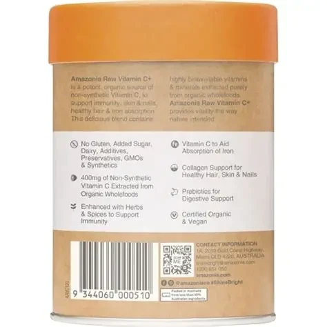 Amazonia RAW Wholefood Extracts Vitamin C+ is a potent, organic source of non-synthetic Vitamin C, designed to support immunity, skin, nails, healthy hair, and iron absorption. This delicious blend contains highly bioavailable vitamins and minerals extracted purely from organic wholefoods. Certified organic and vegan, it provides vitality the way nature intended. Key Features