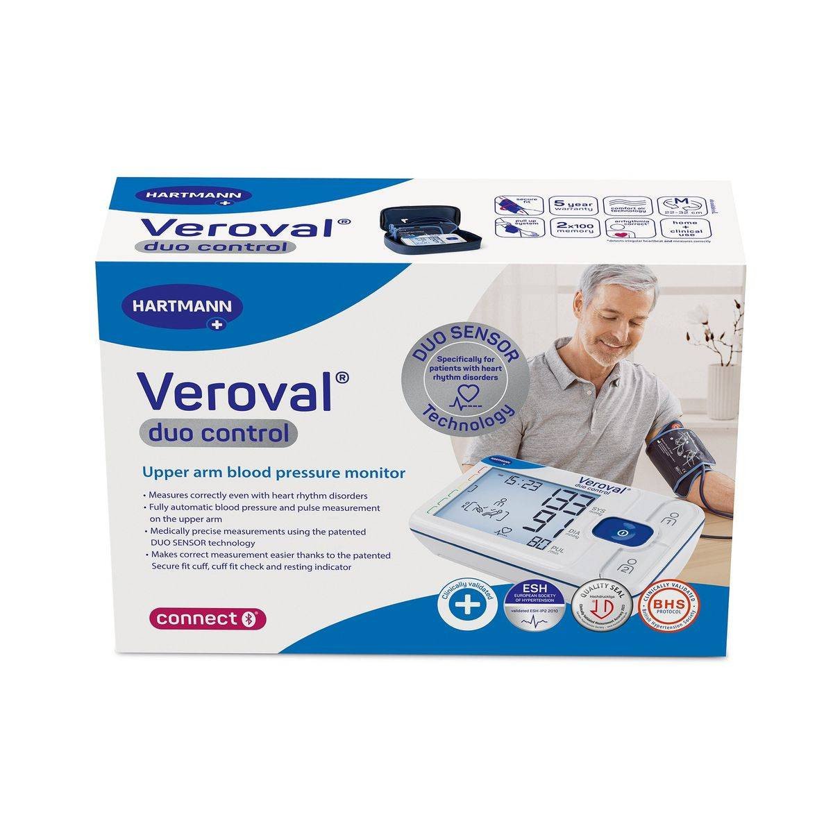 The Veroval Duo Control is a sophisticated blood pressure monitor designed for precise measurements, even in cases of cardiac arrhythmias. It features DUO SENSOR technology, combining Korotkoff and oscillometric methods, and a patented Secure fit cuff for accurate readings. Developed in Germany, it offers a large display and data management via Veroval medi.connect software. Key Features Detects cardiac arrhythmias DUO SENSOR technology Secure fit patented cuff Large illuminated display Traffic light system for analysis Comfort Air Technology Data management via Veroval medi.connect Clinically validated Developed in Germany Powered by 4 AA batteries The Veroval Duo Control is a sophisticated blood pressure monitor designed for precise measurements, even in cases of cardiac arrhythmias. It features DUO SENSOR technology, combining Korotkoff and oscillometric methods, and a patented Secure fit cuff for accurate readings. Developed in Germany, it offers a large display and data management via Veroval medi.connect software.Use As Directed For Blood Pressure Measurement On The Upper Arm.Self-Measurement Values Are For Informational Purposes Only And Should Not Replace Medical Advice.