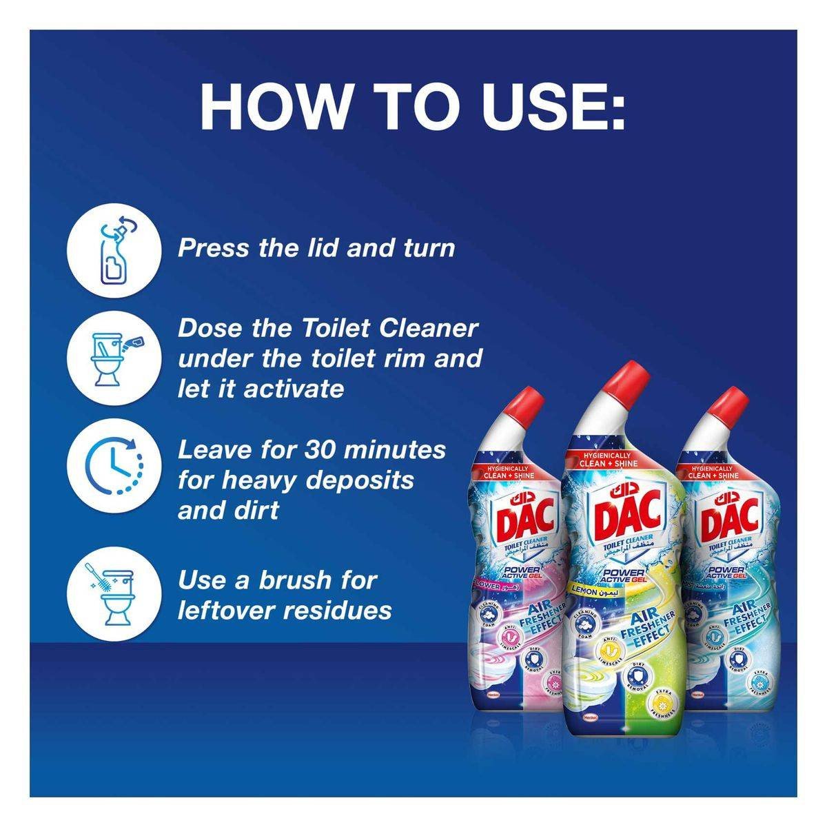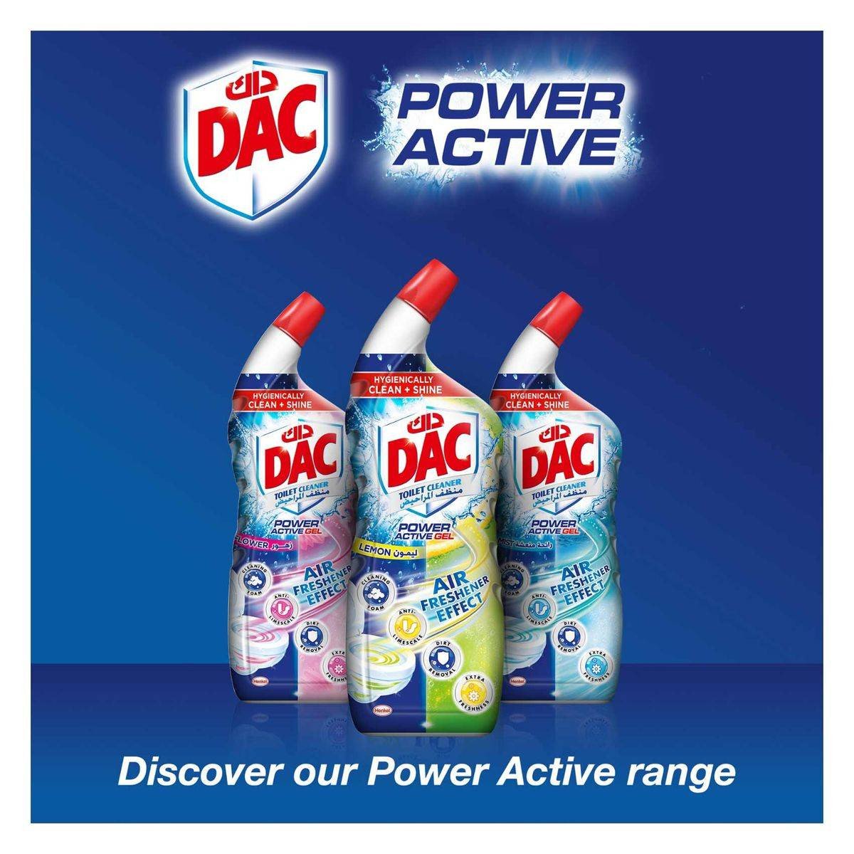 Dac Toilet Cleaner Fresh Mist is a powerful cleaning solution designed to provide hygienic cleanliness and shine. Its self-active formula ensures effortless cleaning, limescale removal, and a fresh scent without the need for scrubbing. Ideal for maintaining a sparkling toilet with minimal effort. Key Features Fresh Mist scent Self-active formula Effective in dirt removal Shiny white toilet Intensely fresh fragrance Easy-to-use toilet cleaner Eco-friendly and recyclable Hypoallergenic formula 5% Non-Ionic Surfactants, Further Ingredients, Perfumes.Dac Toilet Cleaner Fresh Mist is a powerful cleaning solution designed to provide hygienic cleanliness and shine. Its self-active formula ensures effortless cleaning, limescale removal, and a fresh scent without the need for scrubbing. Ideal for maintaining a sparkling toilet with minimal effort.Dose The Toilet Cleaner Under The Toilet Rim And Let It Activate. Leave For 30 Minutes For Heavy Deposits And Dirt. Use A Brush For Leftover Residues.Store In Dry And Cool Places.