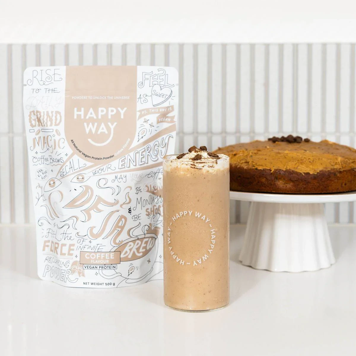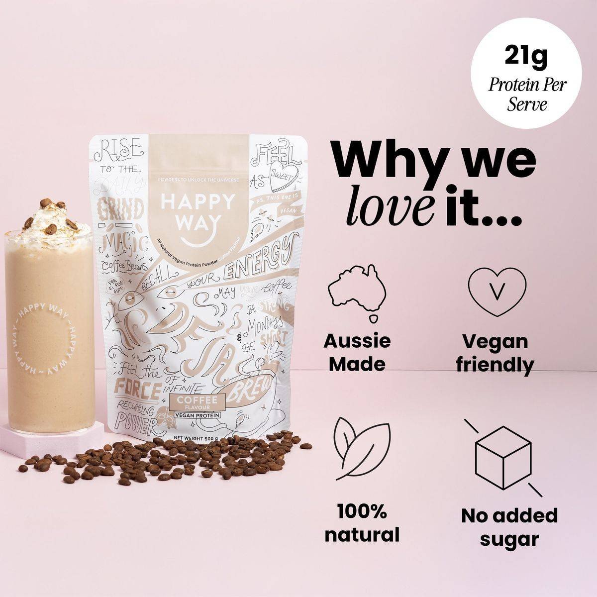 Happy Way Vegan Protein Powder Coffee 500g is a nutrient-rich blend designed for an active lifestyle. It provides protein, fiber, and essential minerals, invigorates the senses with coffee flavor, and supports muscle and mind health. Key Features Organic Vegetarian Vegan Dairy Free Gluten Free Plant Protein Blend (80%) (Organic Yellow Pea Protein, Organic Brown Rice Protein), Natural Flavouring, Coconut Powder (Containing Medium Chain Triglycerides, Acacia Gum), Organic Maca Powder, Organic Chia Seeds, Psyllium Husk, Fine Ground Arabica Coffee Bean, Guar Gum, Sweeteners (Steviol Glycoside, Thaumatin), Himalayan Rock Salt.Happy Way Vegan Protein Powder Coffee 500g is a nutrient-rich blend designed for an active lifestyle. It provides protein, fiber, and essential minerals, invigorates the senses with coffee flavor, and supports muscle and mind health.Add 2 Scoops (30G) To A Shaker Cup. Fill With 300Ml Of Chilled Water Or Plant-Based Milk. Shake For 10-15 Seconds Or Blend For Smoother Texture. Enjoy!Consult Healthcare Provider Before Use If You Have Health Conditions. Pregnant Or Breastfeeding Women Should Exercise Caution.