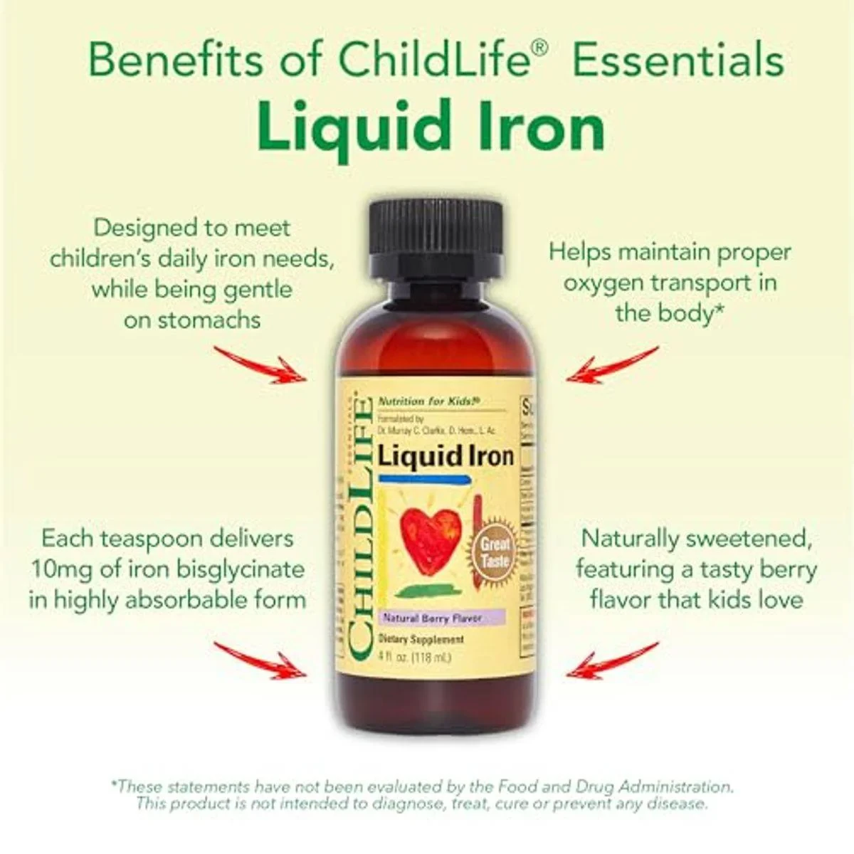 Childlife Liquid Iron is a dietary supplement designed to meet children's daily iron needs. It helps maintain proper oxygen transport in the body and is gentle on young stomachs. The liquid formula is naturally sweetened with a tasty berry flavor that kids love. Free from artificial colors, flavors, and sweeteners, it is suitable for children 6 months and older. Key Features Gentle on stomachs Highly absorbable iron bisglycinate Natural berry flavor No artificial colors, flavors, or sweeteners Gluten-free and casein-free Convenient liquid formula Designed for children's daily iron needs Iron (as Iron Bisglycinate), Purified Water, Fructose, Citric Acid, Natural Flavors, Potassium Sorbate, Sodium Benzoate.Childlife: Trusted for natural children's vitamins and supplements.Infants 6-12 months: 1/2 tsp daily. Children 1-3 years: 1 tsp daily. Children 4+ years: 1 tsp daily. Shake well before use.These statements have not been evaluated by the Food and Drug Administration. This product is not intended to diagnose, treat, cure, or prevent any disease.