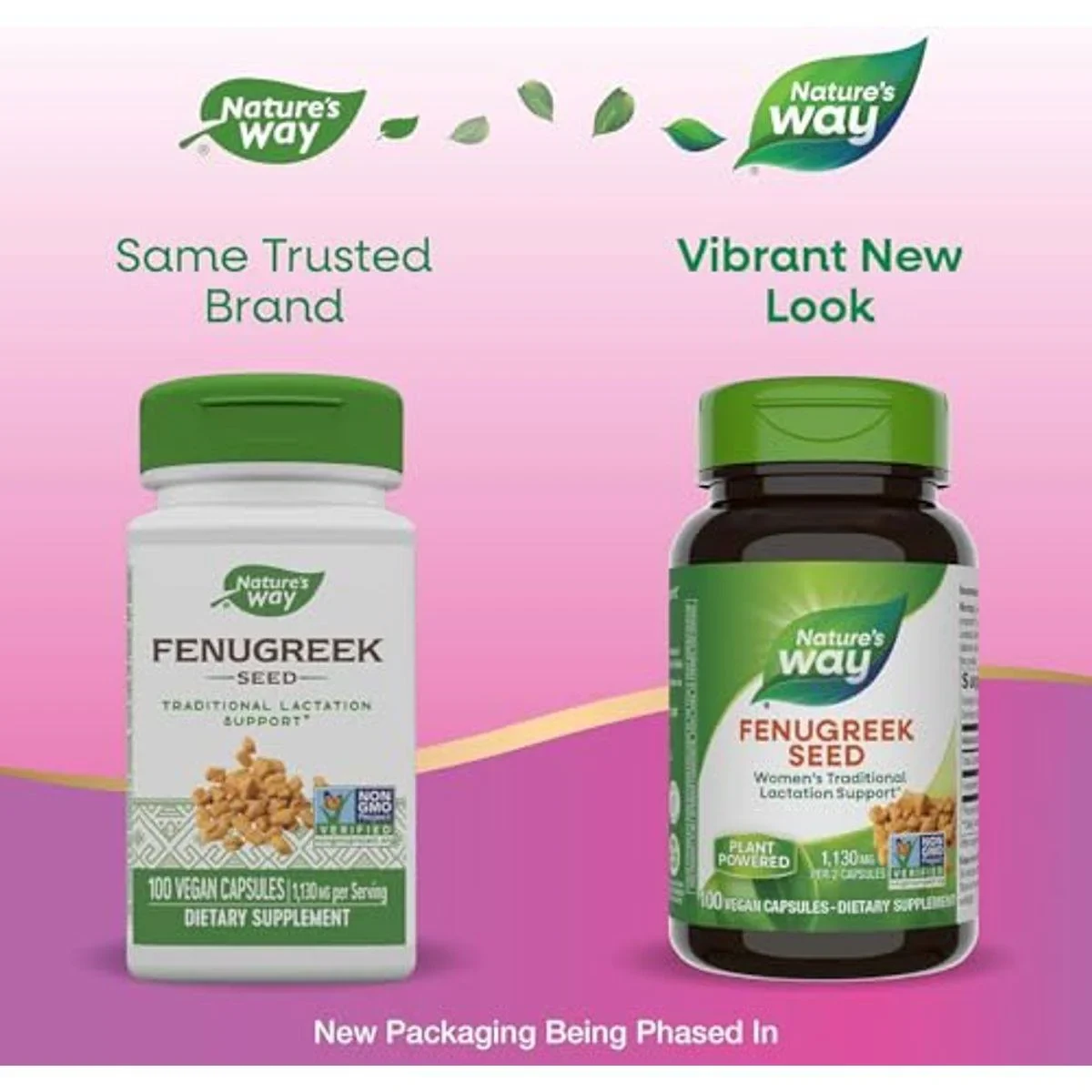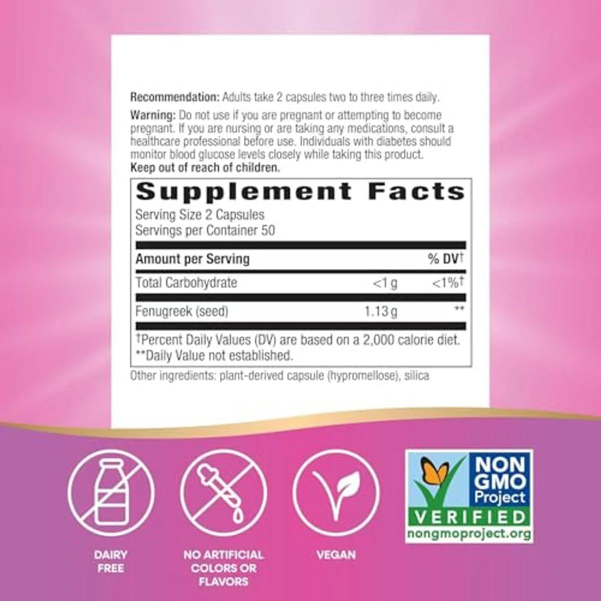 Natures Way Fenugreek Seed capsules provide traditional lactation support with 1,130 mg of fenugreek per serving. Vegan and non-GMO, they are free from artificial colors, flavors, and preservatives. Key Features Traditional lactation support Vegan and non-GMO Free from artificial colors and flavors Contains 1,130 mg fenugreek per serving Dairy-free formulation Plant-powered supplement Fenugreek (seed), Plant-derived capsule (hypromellose), Silica.Nature's Way: Trusted for quality supplements, supporting wellness journeys for over 50 years.Adults take 2 capsules two to three times daily.Do not use if you are pregnant or attempting to become pregnant. If you are nursing or are taking any medications, consult a healthcare professional before use. Individuals with diabetes should monitor blood glucose levels closely while taking this product. Keep out of reach of children.