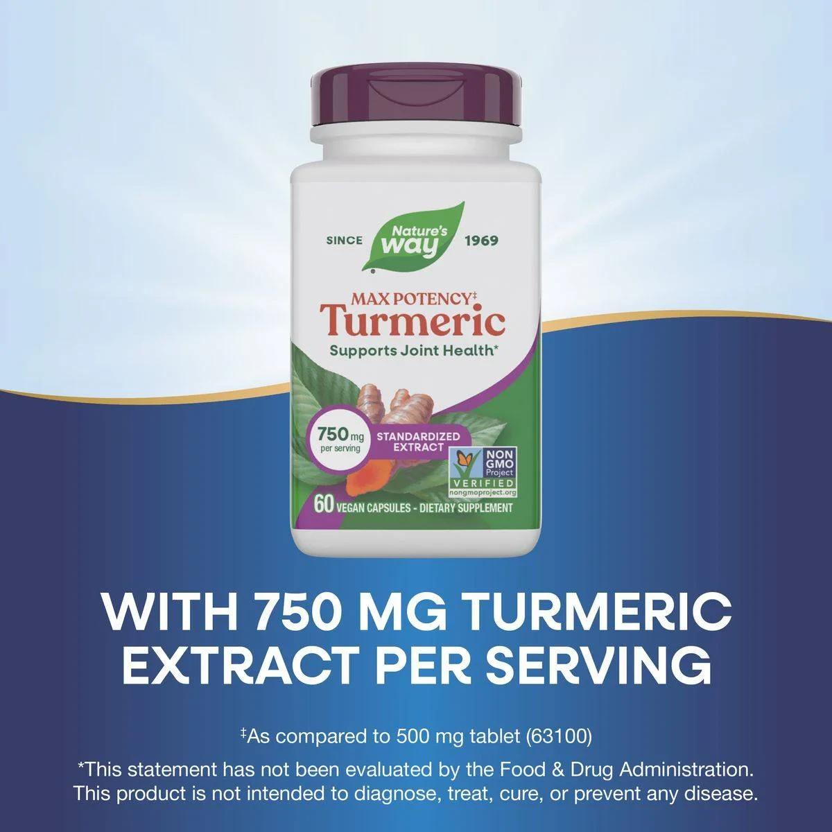 Nature's Way Turmeric Max Potency is a dietary supplement standardized to 95% curcuminoids, supporting joint health. Each serving contains 750mg of turmeric extract, verified Non-GMO, vegan, and gluten-free. Ideal for adults seeking natural joint support. Key Features Supports joint health Standardized to 95% curcuminoids Non-GMO Project Verified Vegan and gluten-free Dairy-free No artificial colors or flavors Turmeric (root, rhizome) Extract standardized to 95% curcuminoids (712.5 mg), Plant-derived capsule (hypromellose), Magnesium stearate, Silica.Nature's Way, a trusted name in dietary supplements, known for premium extracts and sustainable packaging.Adults take 1 capsule twice daily with food or water.Do not take if you are pregnant or nursing. If you have gallstones, a bile duct obstruction, or if you are taking any medications, consult a healthcare professional before use. Keep out of reach of children.