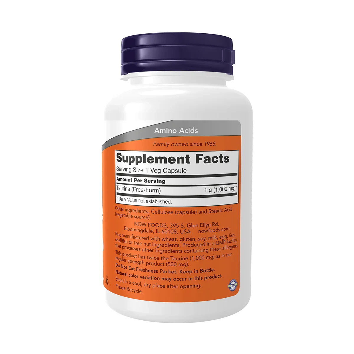 Taurine is a conditionally essential amino acid which is not utilized for protein synthesis, but is mainly found free in most tissues, especially throughout the nervous system.* It functions in tissues by stabilizing cell membranes, aiding the transport of potassium, sodium, calcium and magnesium in and out of cells.* Taurine helps to generate and regulate nerve impulses and supports the maintenance of normal fluid balance; it is also used by the body in visual pathways, as well as in the brain and nervous system, where it works together with glycine and GABA as a neurotransmitter.* Taurine is a conditionally essential amino acid which is not utilized for protein synthesis, but is mainly found free in most tissues, especially throughout the nervous system.* It functions in tissues by stabilizing cell membranes, aiding the transport of potassium, sodium, calcium and magnesium in and out of cells.*Taurine helps to generate and regulate nerve impulses and aids in the maintenance of fluid balance; it is also used by the body in visual pathways, as well as in the brain and nervous system, where it works together with glycine and GABA as a neurotransmitter. This product has twice the Taurine (1,000 mg) as in our regular strength product (500 mg).Taurine is a conditionally essential amino acid which is not utilized for protein synthesis, but is mainly found free in most tissues, especially throughout the nervous system.* It functions in tissues by stabilizing cell membranes, aiding the transport of potassium, sodium, calcium and magnesium in and out of cells.*Taurine helps to generate and regulate nerve impulses and aids in the maintenance of fluid balance; it is also used by the body in visual pathways, as well as in the brain and nervous system, where it works together with glycine and GABA as a neurotransmitter. This product has twice the Taurine (1,000 mg) as in our regular strength product (500 mg).Taurine (Free-Form) 1 g (1,000 mg) Other Ingredients: Cellulose (capsule) and Stearic Acid (vegetable source).