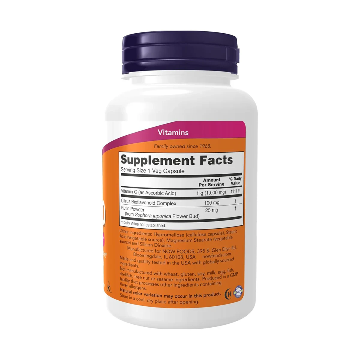 Vitamin C is a water soluble nutrient well known for its vital role in the immune system.* Vitamin C is also necessary for the production of collagen (a structural protein in connective tissue) and is therefore important for skin, bone, and joint health.* Vitamin C is needed for amino acid metabolism, neurotransmitter synthesis, and the utilization of many nutrients, such as folic acid and iron.* It is also a highly effective antioxidant that can help maintain healthy tissues by neutralizing free radicals generated during normal metabolism and exposure to environmental stressors.* This product includes bioflavonoids, which work synergistically to support vitamin C utilization.* Vitamin C is a water soluble nutrient well known for its vital role in the immune system. Vitamin C is also necessary for the production of collagen (a structural protein in connective tissue) and is therefore important for skin, bone, and joint health. Vitamin C is needed for amino acid metabolism, neurotransmitter synthesis, and the utilization of many nutrients, such as folic acid and iron. It is also a highly effective antioxidant that can help maintain healthy tissues by neutralizing free radicals generated during normal metabolism and exposure to environmental stressors. this product includes bioflavonoids, which work synergistically to support vitamin C utilization.Vitamin C is a water soluble nutrient well known for its vital role in the immune system. Vitamin C is also necessary for the production of collagen (a structural protein in connective tissue) and is therefore important for skin, bone, and joint health. Vitamin C is needed for amino acid metabolism, neurotransmitter synthesis, and the utilization of many nutrients, such as folic acid and iron. It is also a highly effective antioxidant that can help maintain healthy tissues by neutralizing free radicals generated during normal metabolism and exposure to environmental stressors. this product includes bioflavonoids, which work synergistically to support vitamin C utilization.Vitamin C (as Ascorbic Acid) 1 g (1,000 mg) , Citrus Bioflavonoid Complex 100 mg, Rutin Powder (Sophora japonica) (Flower Bud) 25 mg. Hypromellose (cellulose capsule), Stearic Acid (vegetable source), Magnesium Stearate (vegetable source) and Silicon Dioxide.