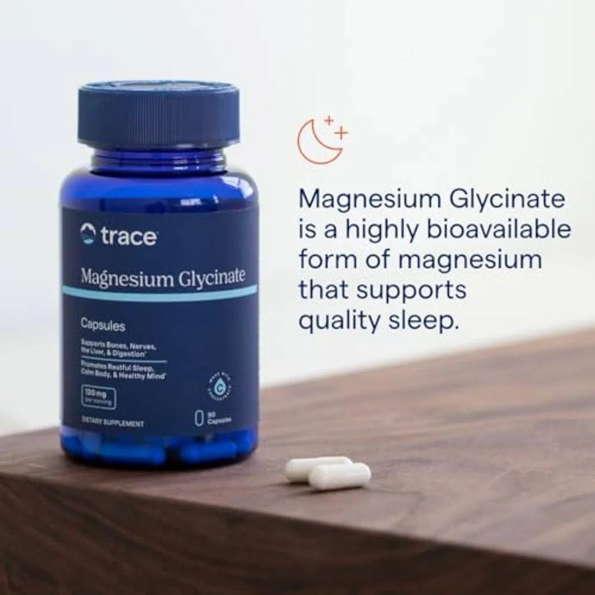 Trace Minerals Magnesium Glycinate 120mg is a highly absorbable magnesium supplement designed to support bone strength, muscle relaxation, and healthy sleep patterns. Each capsule contains 120mg of magnesium glycinate, known for its high bioavailability and gentle effect on the stomach. Ideal for daily use, it aids in maintaining calm muscles and a balanced mood. Features Supports restful sleep Calm mood and muscles Highly bioavailable magnesium Gluten-free and vegan Supports bone and nerve health Magnesium Glycinate, ConcenTrace Trace Mineral Complex, Hypromellose (capsule), Magnesium Stearate, Silicon Dioxide.Trace Minerals: Experts in mineral supplements