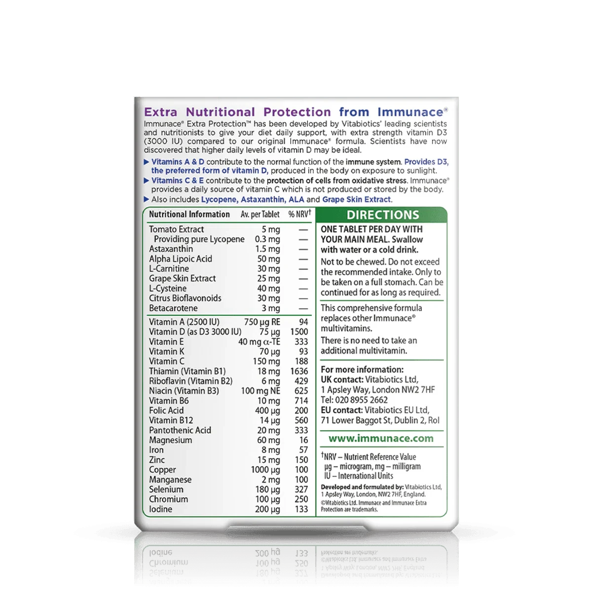 Vitamin C, Magnesium Hydroxide, Vitamin E, Citrus Bioflavonoids, L-Cysteine, L-Carnitine Tartrate, Zinc Sulphate, Thiamin, Niacin, Pantothenic Acid, Ferrous Fumarate, Betacarotene, Vitamin B6, Manganese Sulphate, Vitamin A, Riboflavin, Vitamin B12, Vitamin K1, Copper Sulphate, Vitamin D3, Chromium Trichloride, Folic Acid, Sodium Selenate, Potassium Iodide.Vitabiotics: Pioneers in nutritional health, offering advanced supplements for immune support and vitality.Take one tablet per day with your main meal. Swallow with water or a cold drink. Not to be chewed.Consult your doctor before using if you are under medical supervision, pregnant, breast-feeding, have epilepsy, a thyroid disorder, haemochromatosis, suffer from food allergies, or are allergic to any of the ingredients. Not suitable for children under 12 years. As Immunace contains vitamin K, if you are taking oral anticoagulants (blood thinning medication) do not take these tablets except on the advice of a doctor. This product contains iron, which if taken in excess, may be harmful to very young children.