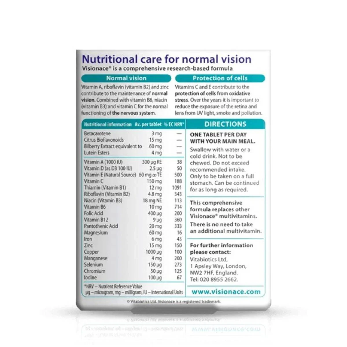 Vitamin C (Ascorbic Acid, Carrier: Glyceryl Tristearate), Bulking Agents: Microcrystalline Cellulose & Dibasic Calcium Phosphate, Magnesium Oxide, Vitamin E Natural Source (D-Alpha Tocopheryl Acid Succinate) (from Soya), Lutein Esters & Zeaxanthin Esters (Carriers: Sugar, Natural Vitamin E, Ascorbyl Palmitate, Cellulose Gum), Zinc Sulphate, Tablet Coating (Hydroxypropylmethylcellulose, Hydroxypropylcellulose, Caprilic/Capric Triglycerides, Natural Source Colours [Titanium Dioxide, Iron Oxides], Glycerin), Pantothenic Acid (as Calcium Salt), Citrus Bioflavonoids, Anti-Caking Agents: Stearic Acid, Magnesium Stearate & Silicon Dioxide, Thiamin (Vitamin B1 as Mononitrate), Niacin (Nicotinamide), Ferrous Fumarate, Betacarotene (Carriers: Starch, Water, Antioxidant: DL-Alpha Tocopherol), Vitamin B6 (Pyridoxine HCI), Bilberry Extract, Manganese Sulphate, Cross-linked Cellulose Gum, Riboflavin (Vitamin B2), Hydroxypropylmethylcellulose, Vitamin A (Vitamin A Acetate [Carriers: Maltodextrin, Gum Acacia, Corn Starch, Antioxidant: DL-Alpha Tocopherol]), Copper Sulphate, Vitamin D3 (Cholecalciferol [Carriers: Acacia, Sucrose, Corn Starch, Medium Chain Triglycerides, Antioxidant: DL-Alpha Tocopherol]), Folic Acid (as Pteroylmonoglutamic Acid), Sodium Selenate, Chromium Trichloride, Potassium Iodide, Vitamin B12 (Cyanocobalamin).Vitabiotics: Leading UK vitamin company known for science-based health supplements.Take one tablet daily with your main meal.Swallow with water or a cold drink. Not to be chewed. Do not exceed recommended intake. Only to be taken on a full stomach.