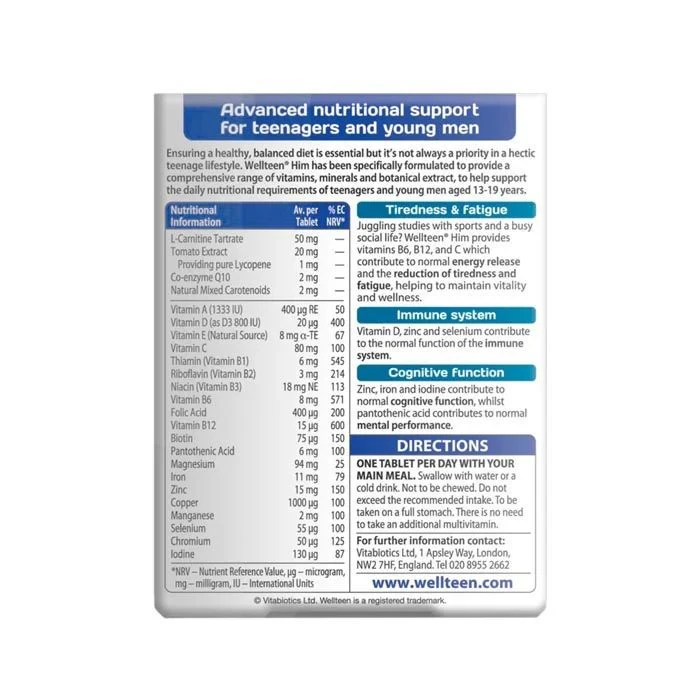 A daily multivitamin specially designed for teenage boys and young men aged 13–19 years. Provides essential vitamins, minerals, and botanical extracts to support energy release, focus, immunity, and overall wellbeing during busy school, study, and sports schedules. Always read the product directions before use. Do not exceed the recommended intake. As with other food supplements seek professional advice before using if you suffer from food allergies, and consult your doctor or pharmacist if you have an underlying medical condition. Vitamin supplements are not intended to treat or prevent any disease. Food supplements must not replace a balanced and varied diet, and a healthy lifestyle. Do not use if you are allergic to soya. This product contains iron, which if taken in excess may be harmful to very young children.Wellteen Him has been specifically formulated to provide comprehensive range of vitamins, minerals and botanical extracts, to help support the daily nutritional requirement of teenagers and young women aged 13 – 19 years. Wellteen Him provides vitamins, B6, B12 and C which contributes to normal energy release and the reduction of tiredness and fatigue helping maintaining vitality and wellness. Vitamin D, Zinc and selenium in Wellteen Him contribute towards the normal function of the immune system. Zinc, iron and iodine contributes to normal cognitive function, whilst pantothenic, acid contributes to normal mental performance • Wellteen Him is free from gluten, artificial colours, preservations, salt and yeast. • Wellteen Him is not tested on animals.Swallow with water or a cold drink. Not to be chewed. Do not exceed the recommended intake. Only to be taken on a full stomach. A regular intake is recommended. There is no need to take an additional multivitamin.