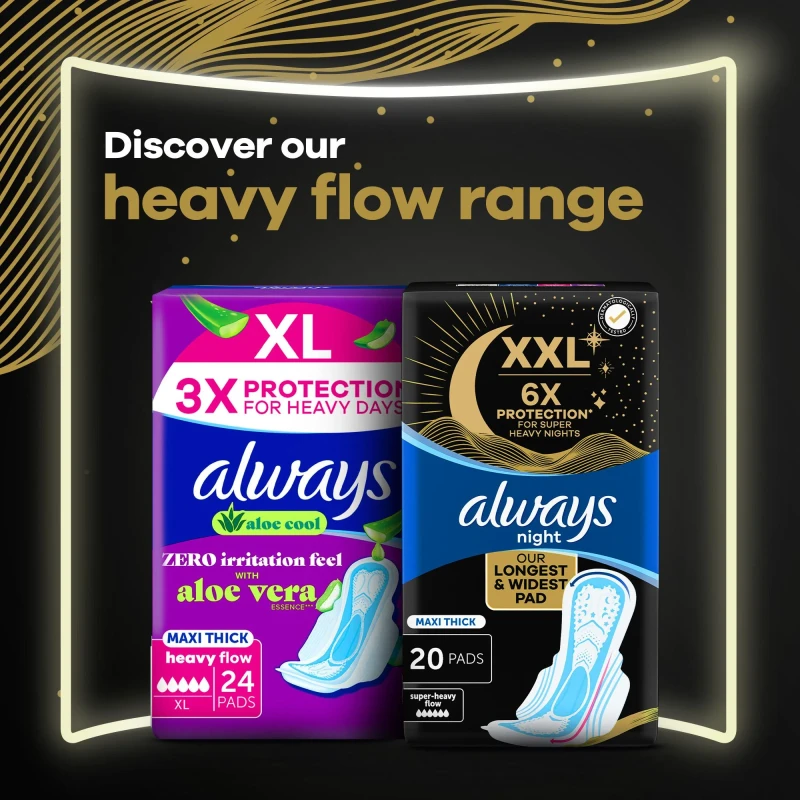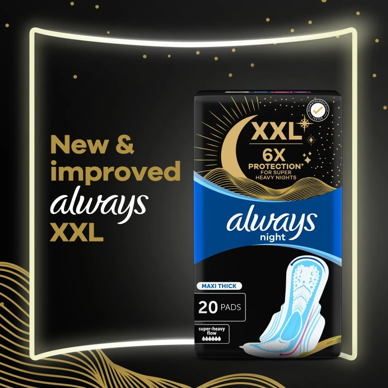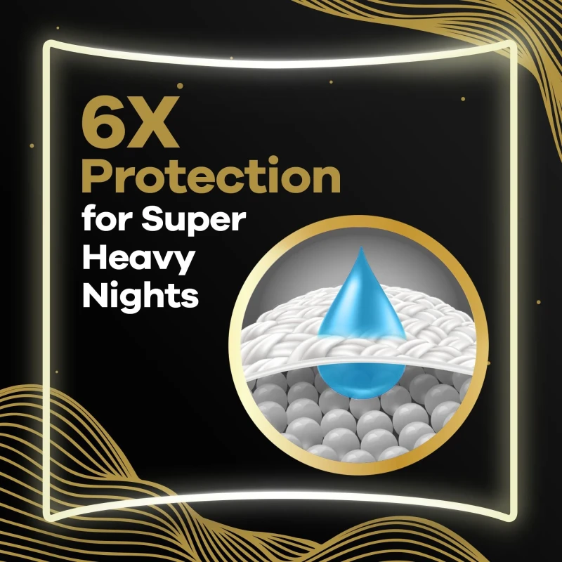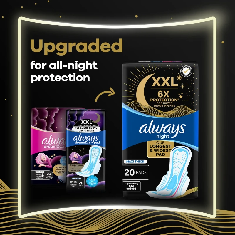 Get uninterrupted sleep during your period with Always Dreamzz Cotton Soft Super Heavy Night pads, offering 360° coverage and protection! The Always DreamZzz pad is our largest pad, providing the ultimate secure night with its longer length, wider back, and upgraded wing design. It offers all-around 360° coverage to protect against leakage and stains overnight. The pad features a breathable topsheet with true cottony softness that is gentle on your skin, ensuring 0% stuffiness throughout the night. Always Dreamzz is designed to protect you in areas where others may fall short, allowing you to sleep tight and dream big. Materials: Thicker Absorbent Core (Fluff Pulp/Sap), Cotton-Feel Non-Woven Cover, Adhesive Backing, Wings. (Extra Long For Plus Coverage).Always offers high-absorbency, extra-long, thicker pads for ultimate overnight protection.Application: Remove pad from wrapper. Peel off backing and place sticky side down onto underwear. Secure wings underneath. Change regularly.For external use only. DO NOT FLUSH. To avoid risk of choking/suffocation, keep plastic bags away from children and pets.