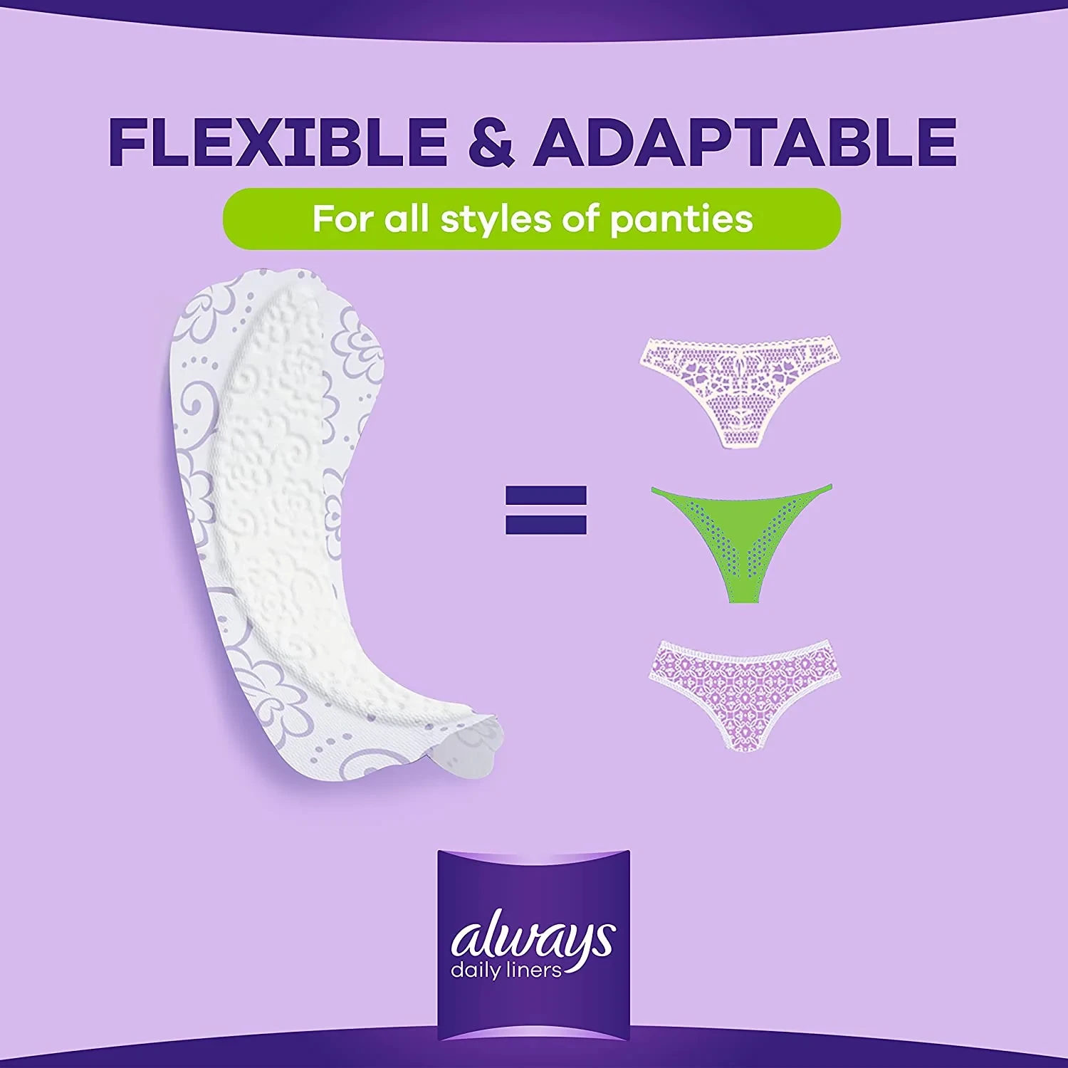 Stay fresh no matter your style. Always Daily Liners flexistyle slim Panty liners give you everyday freshness you can rely on, flexible enough to fit all styles of underwear, yet thinner than 1mm for added comfort and flexibility. With a breathable design that provides trusted dryness these Panty liners are suited for your everyday life. Lightly scented. Ideal for vaginal discharge or as added protection for irregular periods. Versatile Liner (Bulk Pack): A large pack of the flexible Multiform Protect liner.Liner Application: Peel off the backing paper, center the liner adhesive-side-down onto the center of your underwear. Fold the edges underneath if needed to fit thong-style panties. Do not flush.