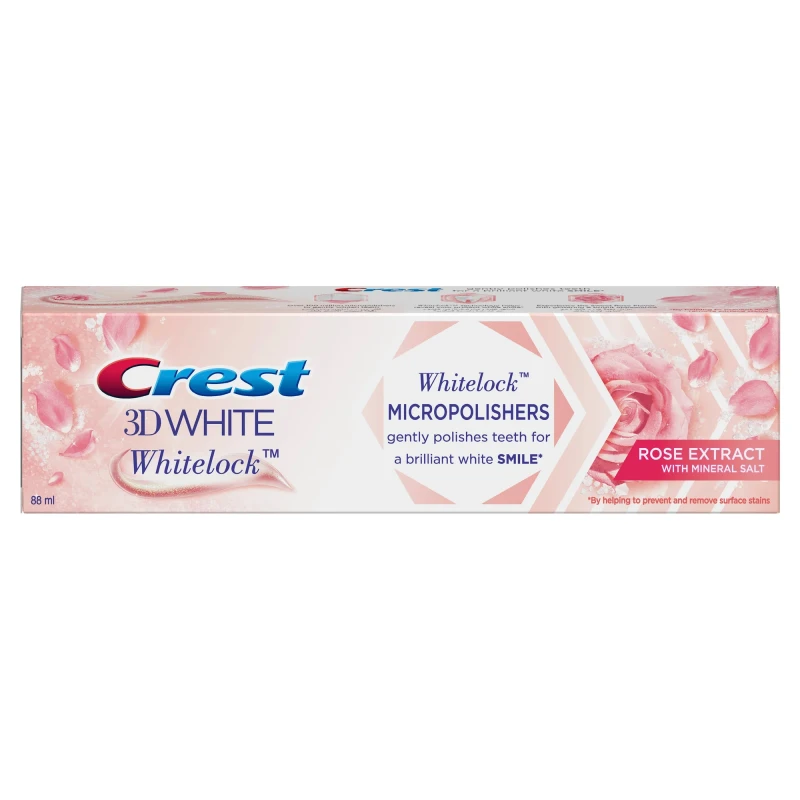 New Crest 3D White with exclusive Whitelock technology Contains 100 million micropolishers that remove 90% of surface stains and help whiten your teeth even more With Whitelock technology, you can be sure your teeth will remain whiter for longer, no matter what you consume Infused with charcoal and peppermint flavor for long-lasting coolness For a brilliant white smile, use twice a day Active: Sodium Fluoride ($sim ext{0.243%}$). Key Inactive: Glycerin, Hydrated Silica, Sodium Hexametaphosphate, Water, Flavor (Rose/Floral notes).General Info: A unique whitening toothpaste with a Rose flavor for a luxurious brushing experience. Features: Locks in whiteness. Gentle yet effective stain removal. Unique floral flavor.Adults and children 12+ years: Brush teeth thoroughly, preferably after each meal or at least twice a day. Do not swallow.