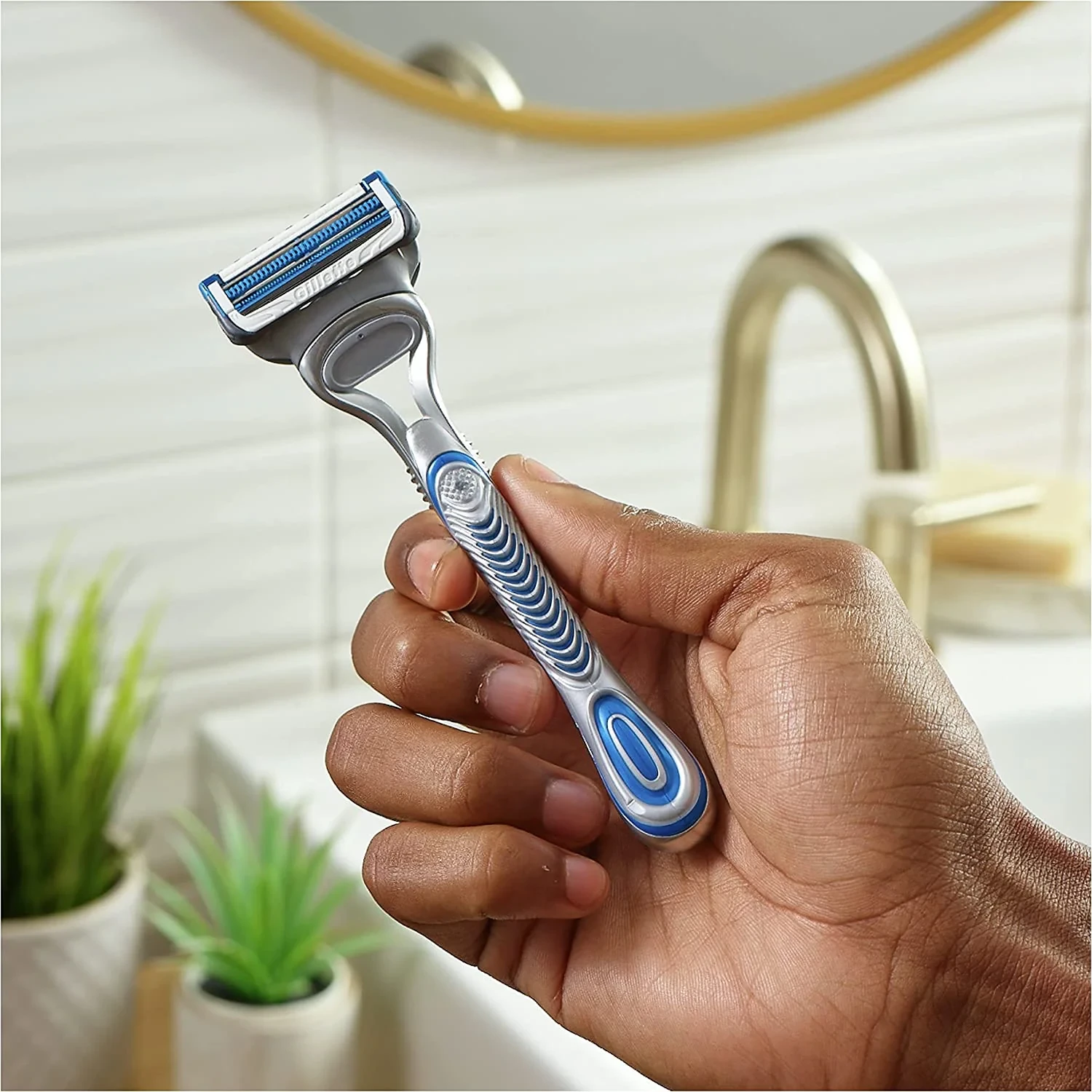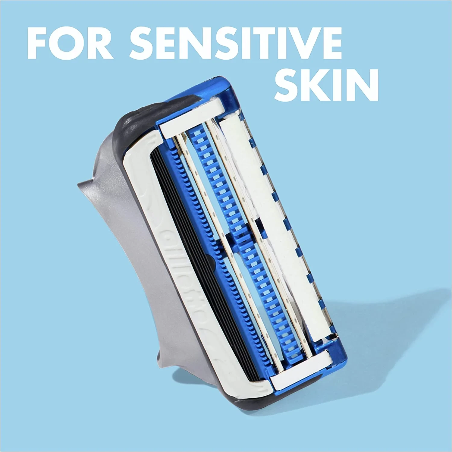 Gillette Blades Skinguard Sensitive 4 RefillsMaterial: Steel blades, Plastic cartridge. Lubrication Strip: PEG-$ ext{115}$M, PEG-$ ext{7}$M, PEG-$ ext{100}$, BHT, Tocopheryl Acetate, Aloe Barbadensis.General Info: Replacement cartridges for the SkinGuard Sensitive razor, designed for men with sensitive skin and razor bumps. 4 refills. Features: SkinGuard Technology between 2 optimally spaced blades to minimize tug and pull. Improved lubrication strip with a touch of Aloe.Click the cartridge onto your SkinGuard handle. Change blade when shaving becomes uncomfortable.