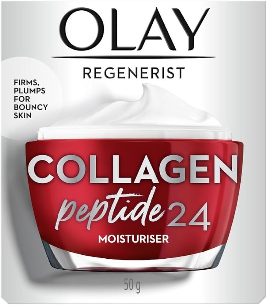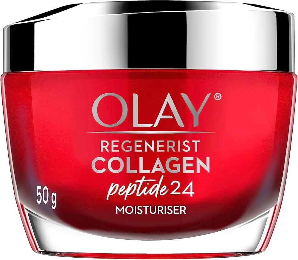 New Olay collagen peptide 24 moisturizer is a fragrance-free & creamy moisturizer, which provides 24 hrs hydration & gives your skin +40% more plumpness vs treatment. Unlike other Collagen moisturizers, the Olay Collagen Peptide 24 moisturizer is designed with Collagen-Peptides that work just like naturally occurring Collagen in the skin. The Olay Regenerist Collagen-Peptide24 + 99% Pure Niacinamide deeply penetrates* into skin (*epidermis layer only) & instantly plumps, visibly firms, and smoothens fine lines for plump and bouncy skin all day long. NO ADDED: Fragrance, Parabens, Pathalates, Mineral Oil, Synthetic Dyes DIRECTIONS:Smooth evenly over cleansed face and neck, morning and night. TECHNOLOGY: Olay Regenerist Collagen-Peptide24 is designed with a unique bioavailable technology, allowing the ingredients to penetrate into the skin and work its magic: Collagen-Peptide: Olay’ Collagen Peptide is a fragment of the same type of collagen found in human skin. This means that it has better affinity to the skin and can penetrate through the skin surface, travelling deeper into the skin. These molecules help skin look plump and bouncy. - Niacinamide (Vitamin B3): Helps the skin retain moisture and stay hydrated. It also helps with surface cell regeneration. - Glycerin: Helps the skin attract and retain moisture so it can stay firm and hydrated all day long INGREDIENT: Water, Glycerin, Niacinamide, Isohexadecane, Dimethicone, Isopropyl Isostearate, Stearyl Alcohol, Polyacrylamide, Pantheno, Palmitoyl Pentapeptide-4, Tremella Fuciformis Sporocarp Extract, Tapioca Starch, C13-14 Isoparaffin, Caprylyl Glycol, Dimethiconol, Laureth-7, Cetearyl Alcohol, Cetearyl Glucoside, Palmitic Acid, Stearic Acid, Cetyl Alcohol, Behenyl Alcohol, Disodium EDTA, PEG-100 Stearate, Titanium Dioxide, Polymethylsilsesquioxane, 1,2-Hexanediol, Phenoxyethanol. Water, Niacinamide (Vitamin B3), Glycerin, Palmitoyl Pentapeptide-4 (Collagen Peptide), Tocopheryl Acetate (Vitamin E), Tapioca Starch, Butylene Glycol, Caprylic/Capric Triglyceride, Dimethicone, Cetyl Alcohol, Stearyl Alcohol, Palmitic Acid, Stearic Acid.Olay Regenerist is the brand's primary anti-aging line. This product focuses on peptides and collagen for firming and moisturizing.Apply liberally to clean face and neck, morning and evening.For external use only. Avoid contact with eyes. Discontinue use if irritation occurs.