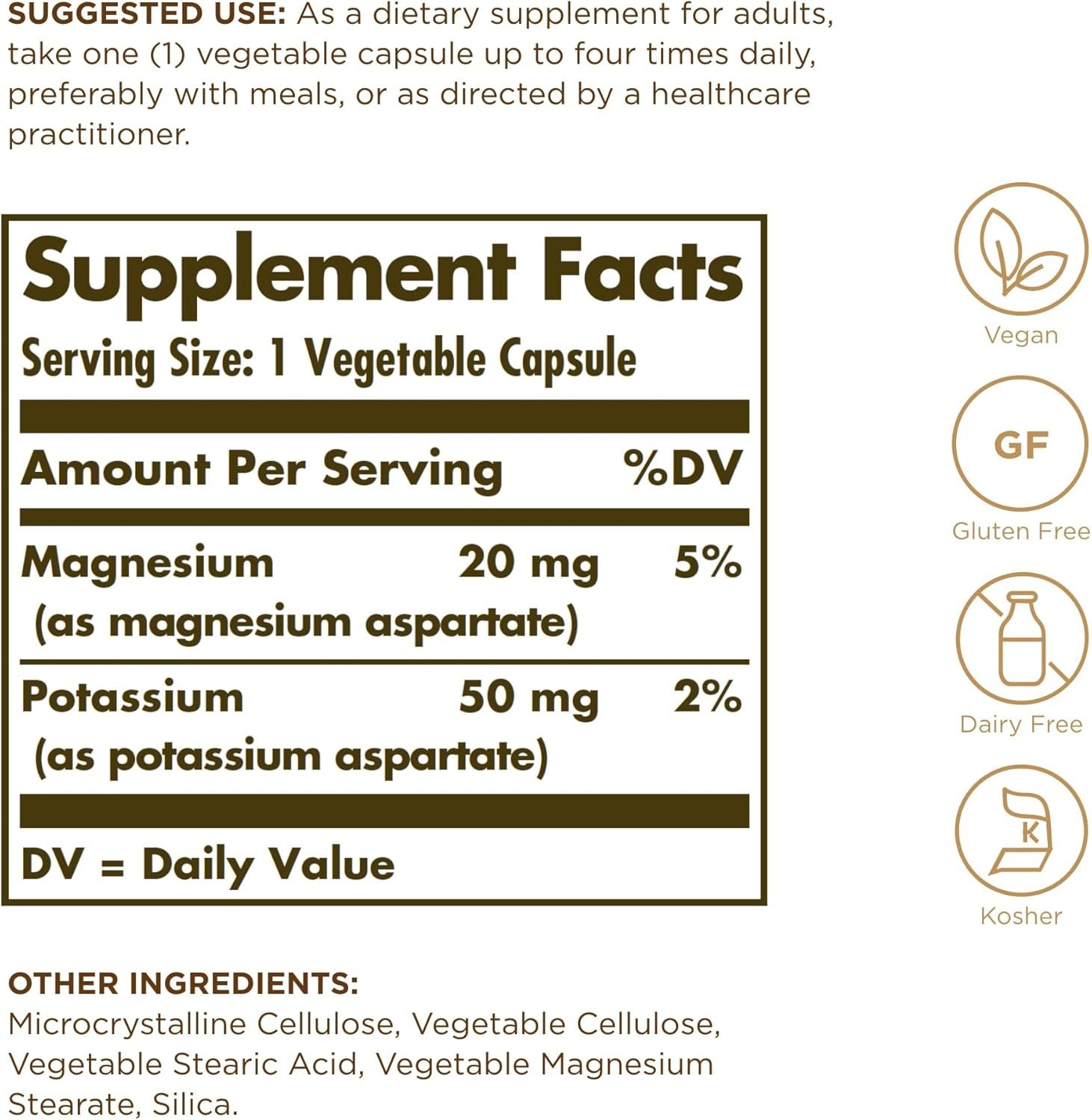 Solgar Potassium Magnesium Aspartate supports electrolyte balance and energy metabolism. Gluten-free and suitable for vegetarians, it promotes muscle health and fluid balance. Key Features Supports electrolyte balance Promotes energy metabolism Non-GMO Gluten, wheat & dairy free Suitable for vegans Supports bone health Promotes cellular energy metabolism Microcrystalline Cellulose, Vegetable Cellulose, Vegetable Stearic Acid, Vegetable Magnesium Stearate, Silica.Solgar: Committed to quality, health, and well-being since 1947. Known for premium nutritional supplements.Take one vegetable capsule up to four times daily, preferably with meals.If you are pregnant, nursing, taking any medications or have any medical condition, please consult your healthcare practitioner before taking any dietary supplement. Discontinue use and consult your healthcare practitioner if any adverse reactions occur. Keep out of reach of children.