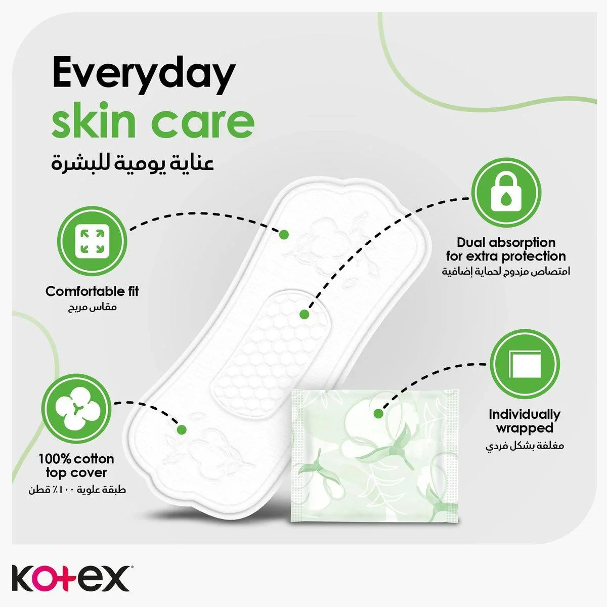 Kotex Pantyliners Natural Normal offers 100% cotton softness for everyday comfort. Dermatologically tested and hypoallergenic, these liners provide extra protection with 2X absorbency. Ideal for sensitive skin, ensuring a natural experience. Key Features 100% Cotton Extra Protect 2X Absorbent Dermatologically Tested Hypoallergenic 0% Plastics, Chlorine & Ink 100% Recyclable Packaging 100% CottonKotex: Trusted for providing unparalleled everyday softness with 100% cotton products.Remove backing paper. Place liner sticky side down onto the center panel of underwear. Change as needed.Dermatologically Tested.Hypoallergenic.
