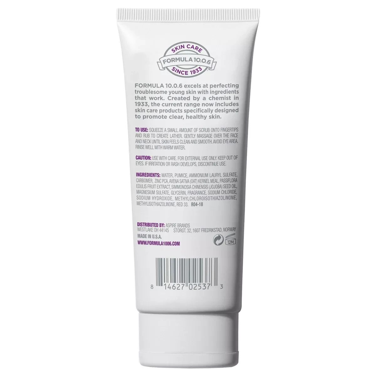 Formula 10.0.6 One Smooth Operator is a pore-clearing face scrub designed to leave skin fresh, smooth, and clear. It contains pumice and oat for deep exfoliation, effectively removing dirt and oils. Ideal for oily skin, clogged pores, and budding acne. Features Purifying scrub for fresh, smooth, and clear skin Contains pumice and oat for deep exfoliation Effective on oily skin, clogged pores, and budding acne Free from dye, parabens, sulfates, and is vegan Water, Pumice, Ammonium Lauryl Sulfate, Carbomer, Zinc PCA, Avena Sativa (Oat) Kernel Meal, Passiflora Edulis Fruit Extract, Simmondsia Chinensis (Jojoba) Seed Oil, Magnesium Sulfate, Glycerin, Fragrance, Sodium Chloride, Sodium Hydroxide, Methylchloroisothiazolinone, Methylisothiazolinone, Red 33.Formula 10.0.6 excels at perfecting troublesome young skin with ingredients that work. Established in 1933, it offers skincare products for clear, healthy skin.Squeeze a small amount onto fingertips, rub to create lather, massage over face and neck, avoid eye area, rinse with warm water.Use with care. For external use only. Keep out of eyes. If irritation or rash develops, discontinue use.