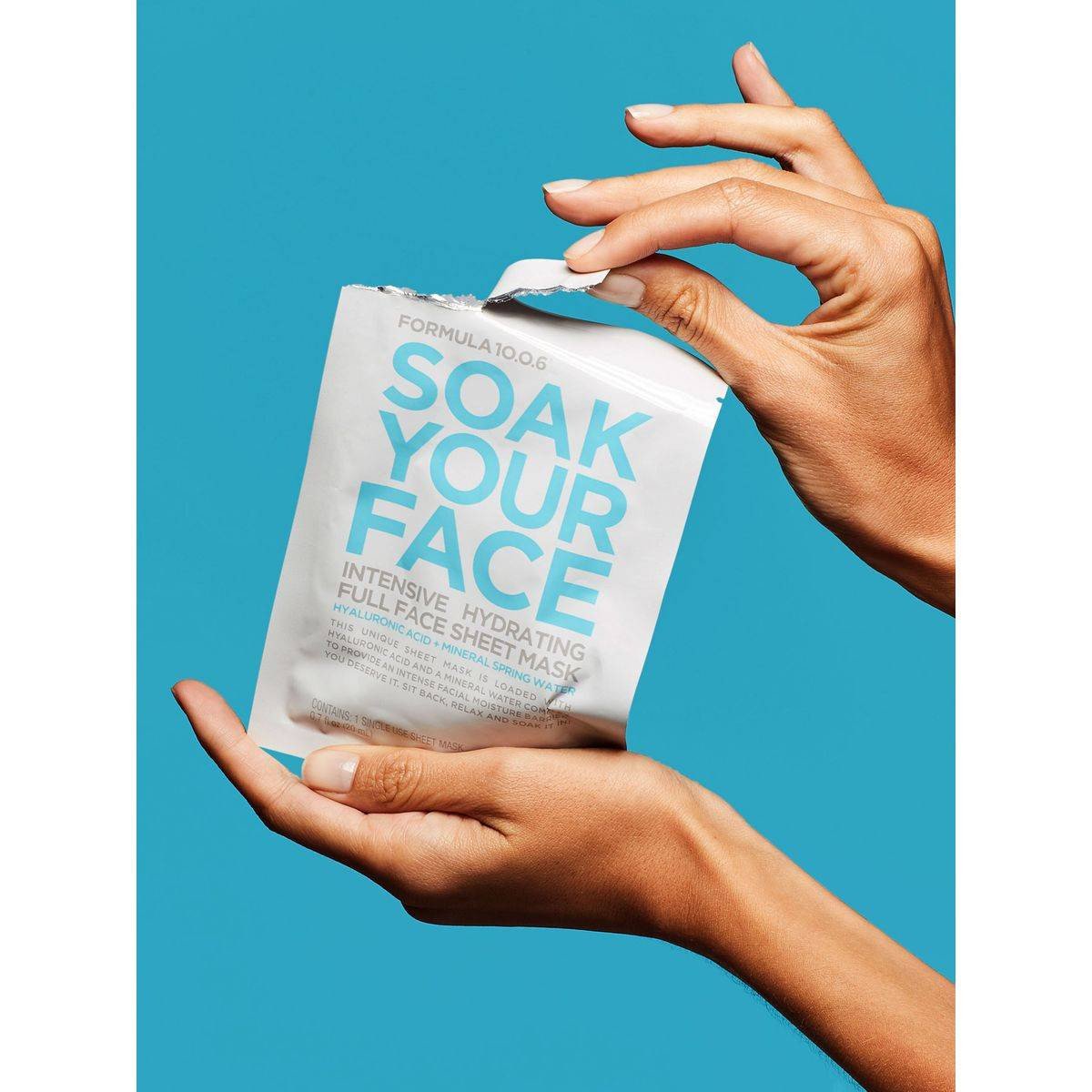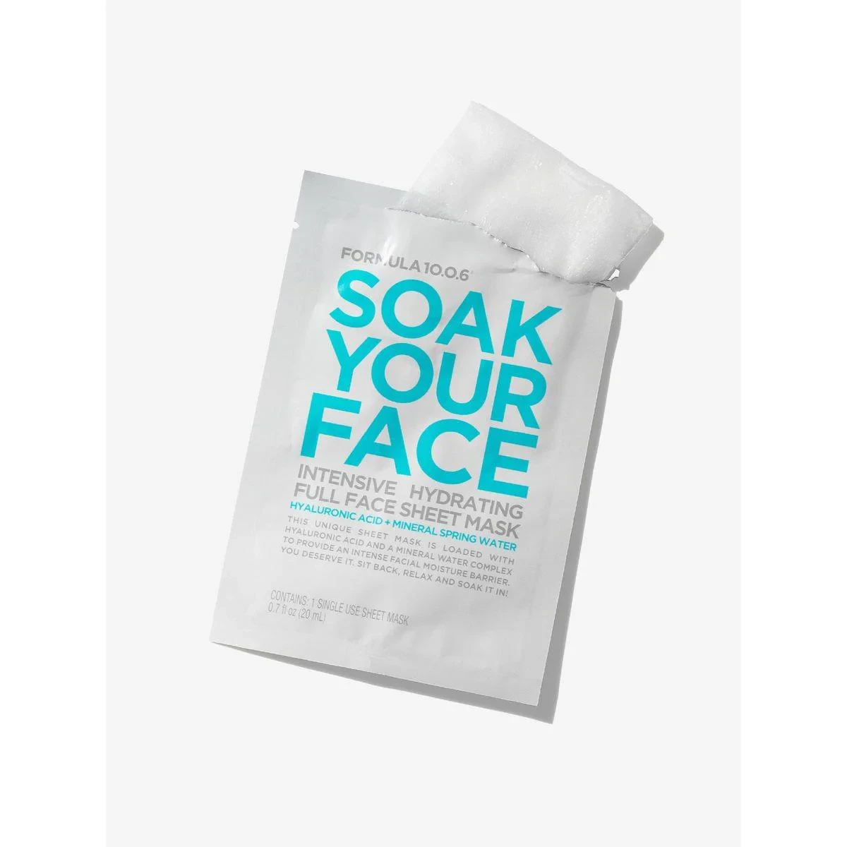 Formula 10.0.6 Soak Your Face Hydrating Sheet Mask is an intensive hydrating full face sheet mask. Enriched with hyaluronic acid and mineral spring water, it provides an intense facial moisture barrier. Perfect for a relaxing skincare routine. Key FeaturesIntensive hydrating full face sheet mask Hyaluronic Acid, Mineral Spring WaterFormula 10.0.6: Skincare solutions with a focus on clear, healthy skin. Known for effective, gentle products.Sit Back, Relax, And Soak It In!For external use only. Keep out of eyes. If irritation or rash develops, discontinue use.