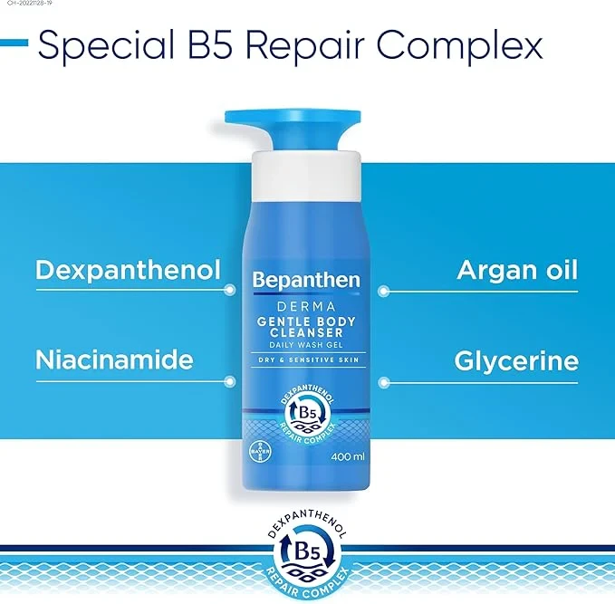 Bepanthen® DERMA Gentle Body Cleanser has a unique soap-free gel formulation. It gently and effectively cleanses and protects, removing impurities while maintaining the skin's natural moisture levels, leaving it feeling fresh and clean without weakening the skin's natural protective barrier. Its B5 Repair Complex contains: Dexpanthenol, which works deep within the skin to repair the