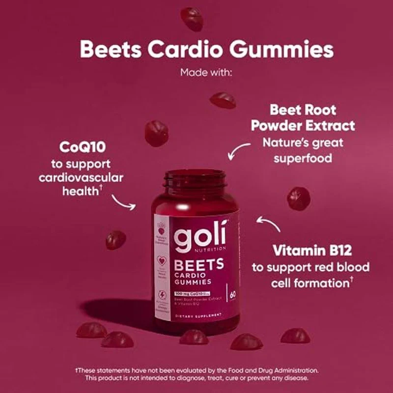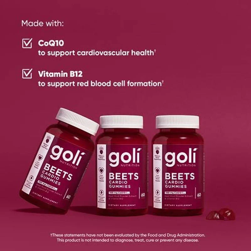 Goli Nutrition Beets Cardio Gummies are a dietary supplement designed to support cardiovascular health. Made with CoQ10 and Beet Root Extract, these vegan gummies also contain Vitamin B12 for cellular energy. They are gluten-free, non-GMO, and gelatin-free, making them suitable for a variety of dietary needs. Enjoy the benefits of nature's great superfood in a convenient gummy form.