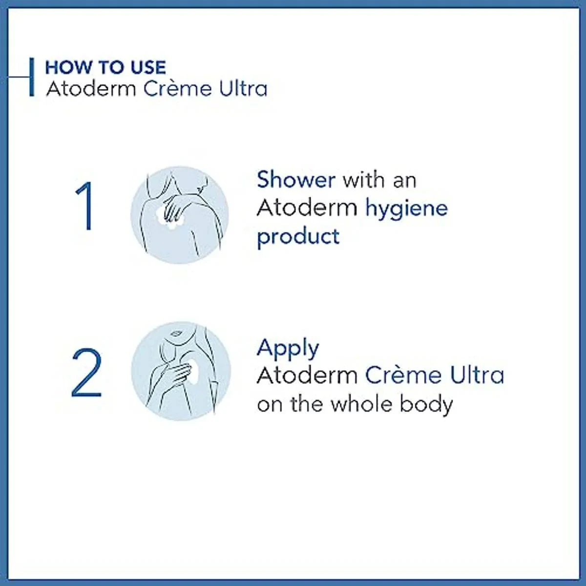 Aqua/Water, Paraffinum Liquidum, Glycerin, Cetearyl Isononanoate, Glyceryl Stearate, Peg-100 Stearate, Myreth-3 Myristate, Steareth-21, Cyclopentasiloxane, Pentylene Glycol, Cyclohexasiloxane, Acrylates/C10-30 Alkyl Acrylate Crosspolymer, Caprylyl Glycol, Cetyl Alcohol, Disodium Edta, Palmitic Acid, Stearic Acid, Xylitol, Mannitol, Rhamnose, Sodium Hydroxide, Sodium Dehydroacetate, Xylitylglucoside, Anhydroxylitol, Niacinamide, Glucose, Fructooligosaccharides, Caprylic/Capric Triglyceride, Laminaria Ochroleuca Extract.Bioderma: Dermatological skincare brand known for innovative solutions for sensitive skin.Apply Atoderm Crème Ultra On The Whole Body After Showering With An Atoderm Hygiene Product.For external use only. Discontinue use if irritation occurs.