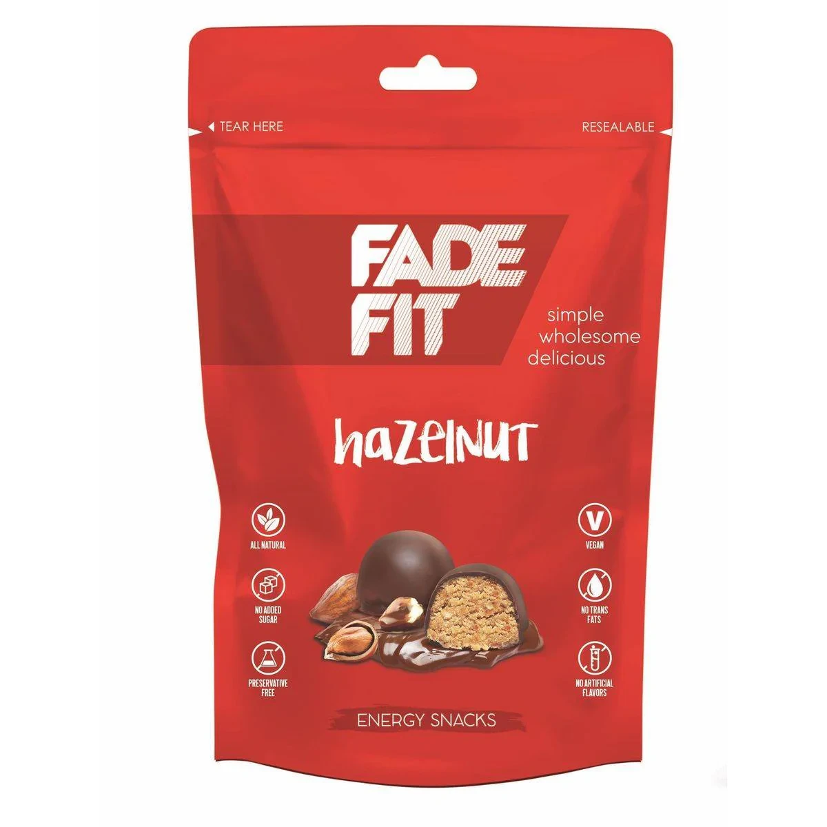 Fade Fit Energy Snacks Hazelnut 45g are vegan-friendly, all-natural snacks with no added sugar or trans fats. Made with dates, dark chocolate, and hazelnut, they offer a guilt-free snacking option. Key Features No Added Sugar All Natural No Artificial Flavour Preservative Free Vegan No Trans Fats Date Paste, Hazelnut, Rice Crispy, Hazelnut Butter (Roasted Hazelnut, Fully Hydrogenated Vegetable Oil (Palm and Rapeseed)), Dark Chocolate [Sugar replacer (Maltitol, Xylitol, Stevia (extract from plant Stevia Rebaudiana)), Cocoa Mass, Cocoa Butter, Cocoa Powder, Emulsifier: Soya Lecithin (E322), Natural Vanilla].Fade Fit offers simple, wholesome, and delicious energy snacks.Eat as a snack, in between meals.Contains Tree nuts, Milk Derivatives and Soya products. May contain traces of Peanuts.