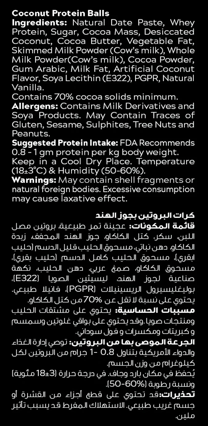 Fade Fit Protein Balls Coconut 60g are a delicious and nutritious snack packed with 11g of protein, perfect for athletes and fitness enthusiasts. Made with coconut, dates, and cocoa, they offer a sweet and nutty taste. Features Keto Friendly Preservative Free No Trans/Hydrogenated Fats Non GMO Suitable for Vegetarians Natural Date Paste, Whey Protein, Sugar, Cocoa Mass, Desiccated Coconut, Cocoa Butter, Vegetable Fat, Skimmed Milk Powder (Cow’s milk), Whole Milk Powder (Cow’s milk), Cocoa Powder, Gum Arabic, Milk Fat, Artificial Coconut Flavor, Soya Lecithin (E322), PGPR, Natural Vanilla.Fade Fit offers nutritious snacks designed for active lifestyles, focusing on protein-rich options.Ready to eat. Consume as a protein snack.May contain shell fragments or natural foreign bodies. Excessive consumption may cause laxative effect.