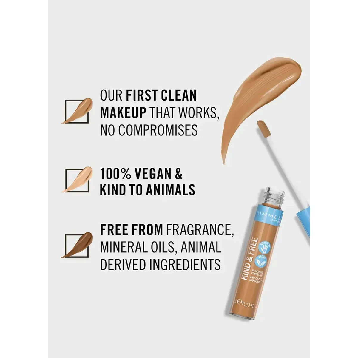 Rimmel Kind & Free Concealer offers lightweight, buildable coverage with an antioxidant complex of vitamins and aloe vera. Made with 80% natural origin ingredients, it hydrates while concealing imperfections. Key Features Lightweight formula conceals and brightens under eye Buildable coverage with antioxidant complex of vitamins & aloe vera Made with 80% ingredients of natural origin 100% vegan & kind to animals Free from fragrance, mineral oils, animal-derived ingredients Key Ingredients: Water, Pigments, Silicone polymers, Glycerin, Aloe Barbadensis Leaf Juice, Film formers.Rimmel London: Innovative makeup brand known for its bold, trend-setting products and commitment to cruelty-free beauty.Apply to blemishes or under-eye circles using the applicator. Blend gently.For external use only. Avoid contact with eyes. If irritation occurs, discontinue use.