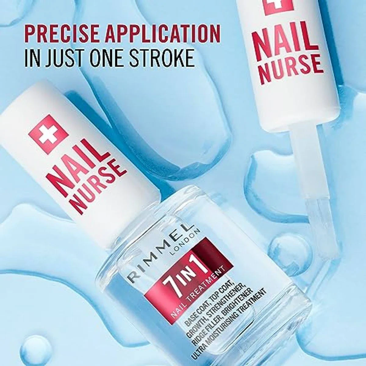 Rimmel Nail Nurse 7 In 1 Nail Treatment offers a comprehensive nail care solution. It serves as a base coat, top coat, and provides growth, strengthening, ridge filling, brightening, and ultra-moisturising benefits. Ideal for maintaining healthy, beautiful nails. Key Features Basecoat Topcoat Growth Strengthener Ridge filler Brightener Ultra-moisturising treatment Quick dry Colour protection Clear universal shade Key Ingredients: Solvents, Nitrocellulose, Proteins/Keratin (Treatment agents), Plasticizers, Vitamins.Rimmel: Iconic London brand known for innovative, affordable beauty products.Apply As A Base Coat Or Top Coat. Use Regularly For Best Results.Flammable. For external use only. Avoid heat/open flame. Keep out of reach of children.