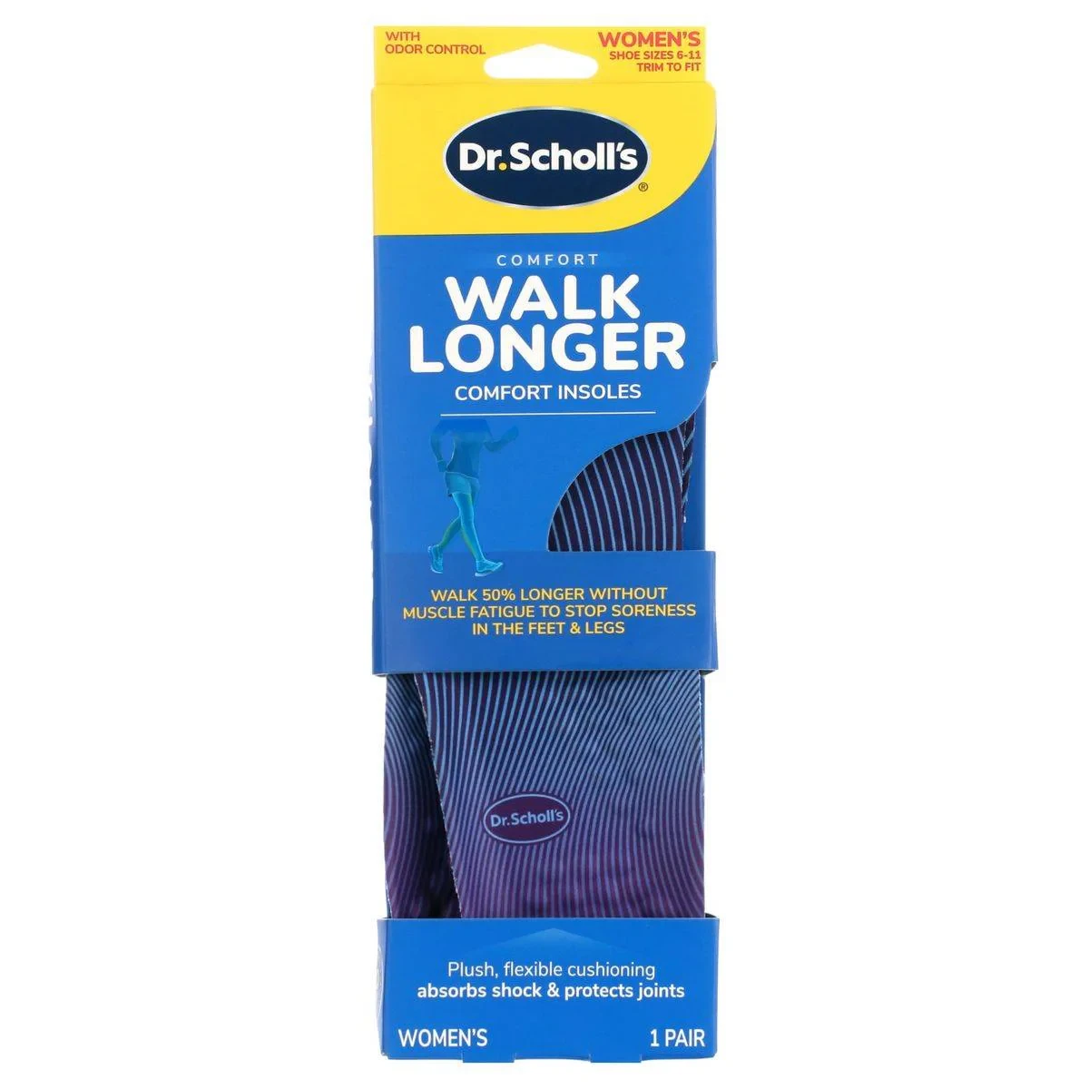 Dr Scholls Walk Longer Comfort Insoles are designed to provide plush cushioning and arch support, reducing muscle fatigue and soreness. Ideal for walking, hiking, and standing, they fit most shoes and can be trimmed to size. Key Features Walk 50% longer without muscle fatigue Plush foam cushioning absorbs shock Flexible arch support adapts to stride Odor-neutralizing layer keeps feet fresh Key Materials: Polymer/Foam blend, Massaging Gel in heel and ball-of-foot area. (Designed for long periods of walking/standing).Dr Scholls: Experts in foot care solutions, offering comfort and support for active lifestyles.Trim insole to fit using a standard pair of sharp scissors.Warning: If Pain Persists, Consult A Physician. If You Have Diabetes, Poor Circulation, Or Fragile Skin, Consult Your Doctor.