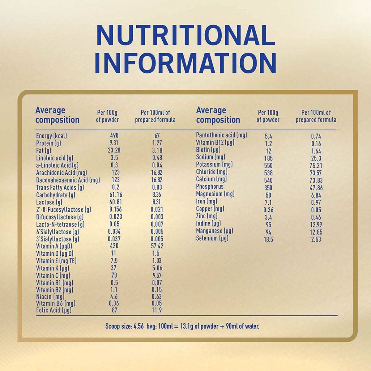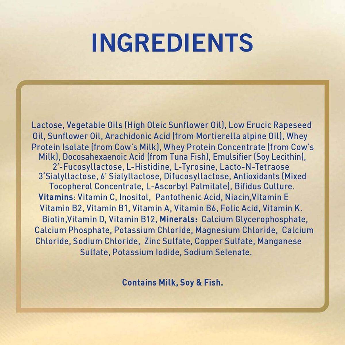 Lactose, Vegetable Oils (High Oleic Sunflower Oil, Low Erucic Rapeseed Oil, Sunflower Oil, Arachidonic Acid from Mortierella alpine Oil), Whey Protein Isolate from Cow's Milk, Whey Protein Concentrate from Cow's Milk, Docosahexaenoic Acid from Tuna Fish, Emulsifier (Soy Lecithin), 2'-Fucosyllactose, L-Histidine, L-Tyrosine, Lacto-N-Tetraose, 3'-Sialyllactose, 6'-Sialyllactose, Difucosyllactose, Antioxidants (Mixed Tocopherol Concentrate, L-Ascorbyl Palmitate), Bifidus Culture, Vitamins (Vitamin C, Inositol, Pantothenic Acid, Niacin, Vitamin E, Vitamin B2, Vitamin B1, Vitamin A, Vitamin B6, Folic Acid, Vitamin K, Biotin, Vitamin D, Vitamin B12), Minerals (Calcium Glycerophosphate, Calcium Phosphate, Potassium Chloride, Magnesium Chloride, Calcium Chloride, Sodium Chloride, Zinc Sulfate, Copper Sulfate, Manganese Sulfate, Potassium Iodide, Sodium Selenate). Contains Milk, Soy & Fish.Nestle: Experts in nutrition, providing quality baby care products for over 150 years.Boil drinking water and allow to cool. Stir until powder is fully dissolved. Check temperature before feeding.Unboiled water, unboiled bottles, or incorrect dilution can make your baby ill. Incorrect storage, handling, preparation, and feeding can potentially lead to adverse effects for the health of your baby.