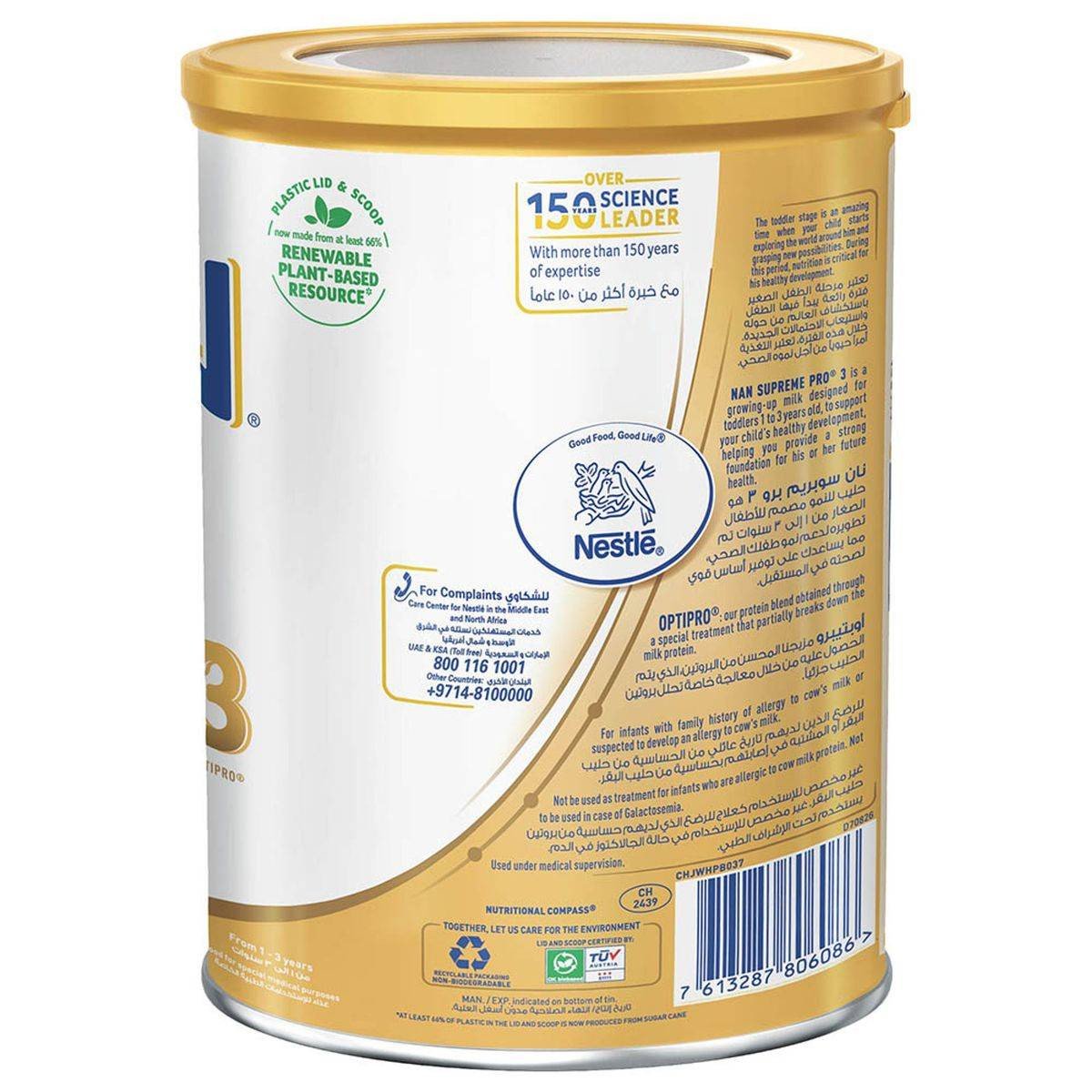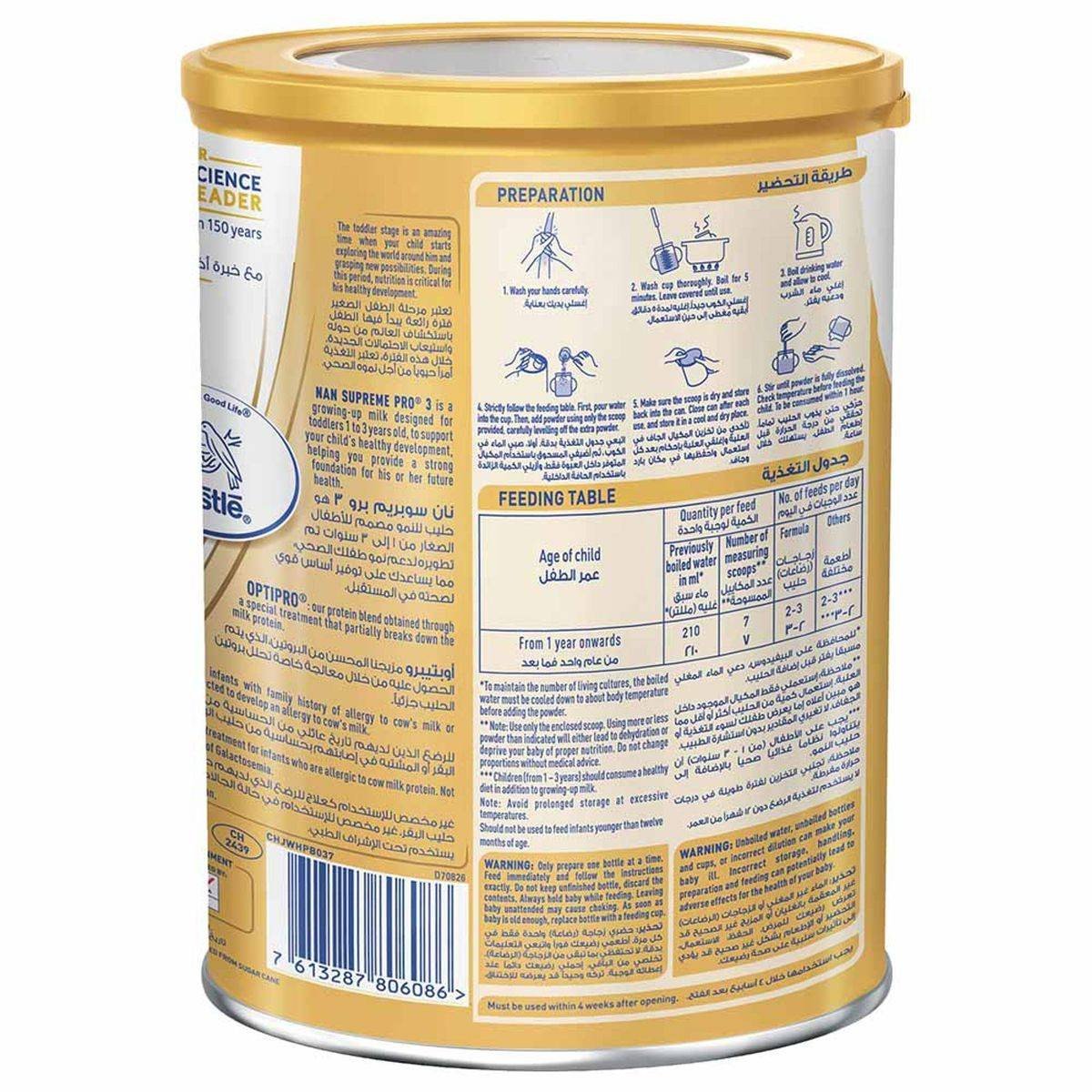 NAN Supreme PRO 3 is a growing-up milk designed for toddlers aged 1-3 years. It supports healthy development and is suitable for allergy-prone infants. The formula contains OptiPro, a special protein blend, and is environmentally friendly with renewable packaging. Key Features