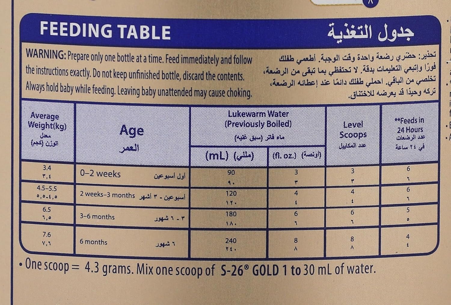 S26 Gold Infant Formula Stage 1 is specially designed for infants aged 0-6 months. Enriched with essential nutrients like Sphingomyelin, DHA, 2'-FL, Lutein, and Choline, it supports fast brain connections and overall healthy development. Ideal for providing proper nutrition and stimulation during the crucial early months of life. Key Features Enriched with nutrients for brain development Contains DHA and Choline Includes 2'-FL and Lutein Suitable for infants 0-6 months Based on cow's milk Contains essential vitamins and minerals 900g net weight Milk solids, Vegetable oils, Whey protein concentrate, Lactose, Emulsifier, Taurine, Nucleotides, L-carnitine, Antioxidants, Vitamins, Minerals, Sphingomyelin, DHA, 2'-FL, Lutein, Choline, Alpha Lipids containing Phospholipids, Oligofructose, Selenium, Zinc, Vitamin A, E, D, Calcium, Alpha Lactalbumin, Iron.Wyeth: Pioneers in infant nutrition, providing high-quality formula for healthy growth and development.Consult feeding table, pour exact amount of lukewarm water into the bottle. Add exact number of level scoops for age of baby. Cap bottle and shake well until powder is dissolved. Feed immediately and follow the instructions exactly.Unboiled water, unboiled bottles or incorrect dilution can make your baby ill. Incorrect storage, handling, preparation and feeding can potentially lead to adverse effects for the health of your baby.