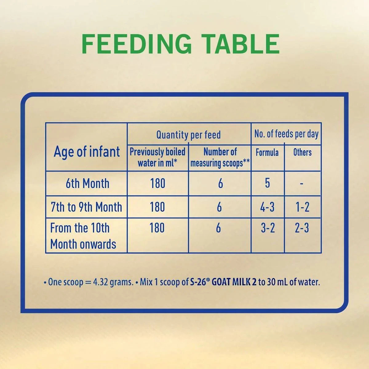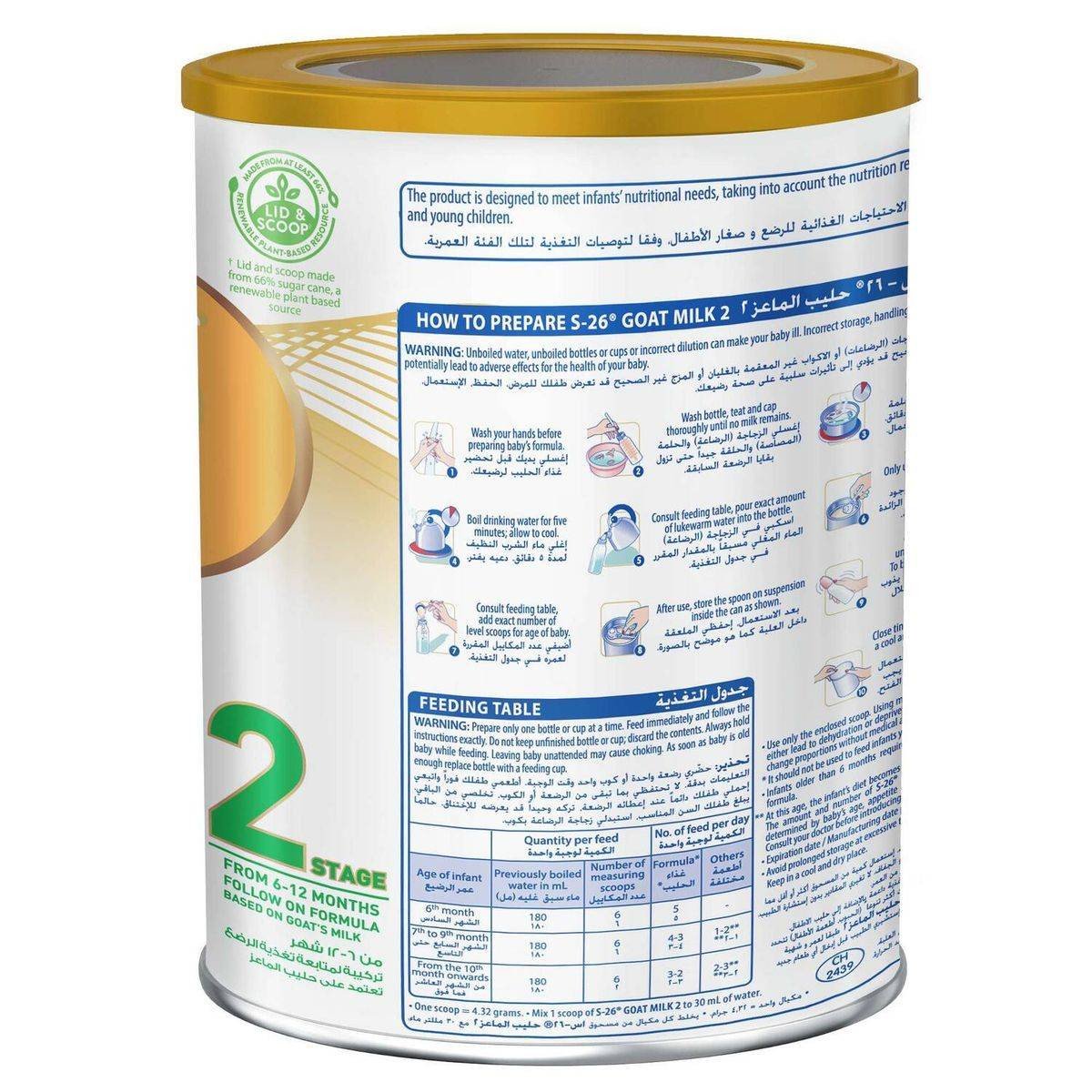 Demineralized Whey (from Goat's Milk), Vegetable Oil, Low Erucic Rapeseed Oil, Coconut Oil, Milk Powder, Soy Lecithin, Docosahexaenoic Acid, L-Isoleucine, L-Reuteri, L-Histidine, L-Tryptophan, Disodium Uridine-phosphate, Adenosine 5'-Monophosphate, Acidity Regulator (Citric Acid), Calcium Citrate, Calcium Phosphate, Magnesium Citrate, Sodium Hydroxide, Zinc Sulfate, Copper Sulfate, Manganese Sulfate, Choline, Vitamin C, Inositol, Niacin, Pantothenic Acid, Vitamin B6, Folic Acid, Vitamin K, Vitamin D, Biotin.Wyeth: Leaders in infant nutrition, providing trusted formulas for healthy development.Mix 1 scoop of S-26 Goat Milk 2 to 30 mL of water. Use only the enclosed scoop.WARNING: Unboiled water, unboiled bottles or cups or incorrect dilution can make your baby ill. Incorrect storage, handling, preparation and feeding can potentially lead to adverse effects for the health of your baby. Prepare only one bottle or cup at a time. Feed immediately and follow the instructions exactly. Do not keep unfinished bottle or cup; discard the contents. Always hold baby while feeding. Leaving baby unattended may cause choking. As soon as baby is old enough replace bottle with a feeding cup.