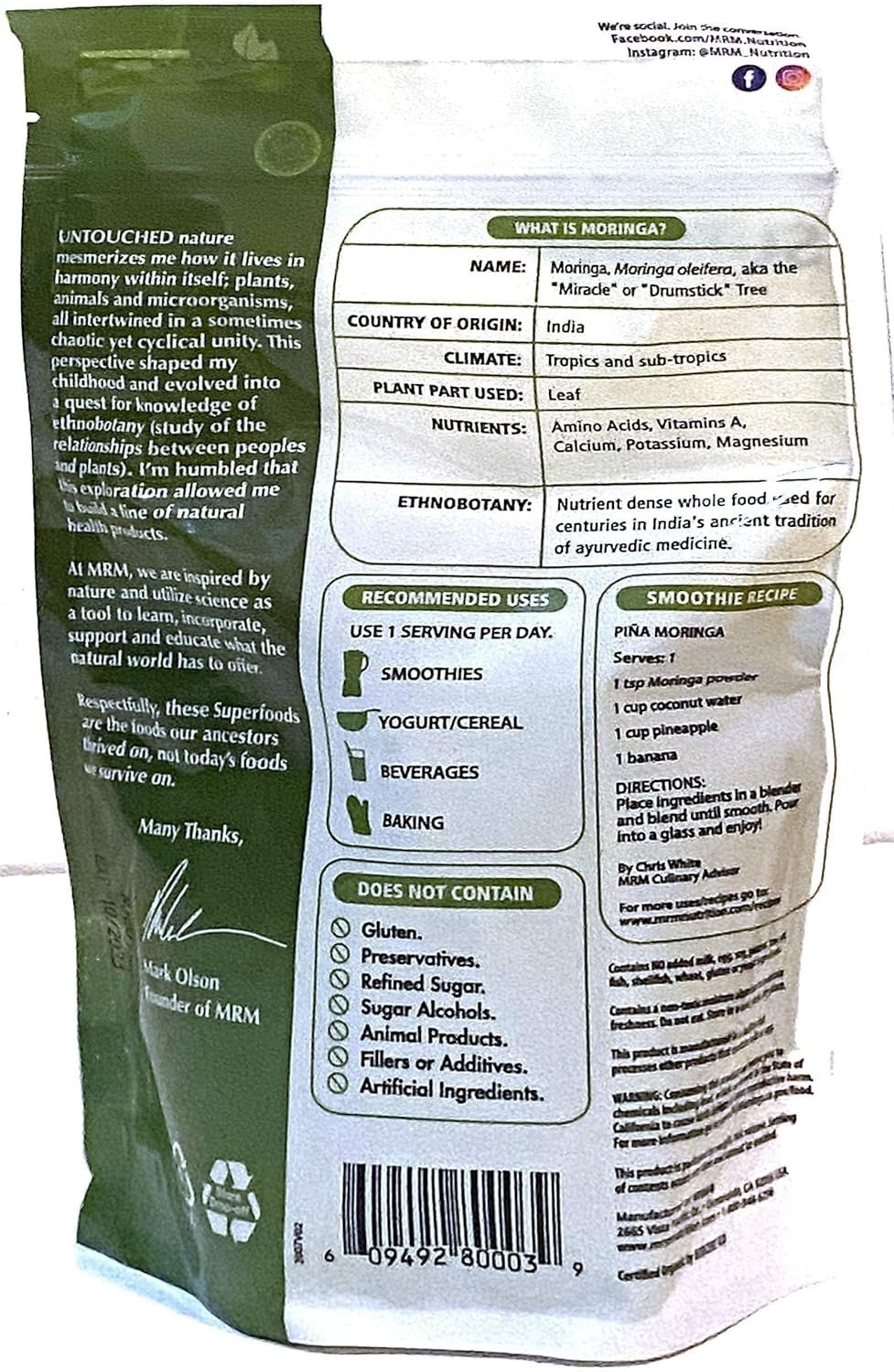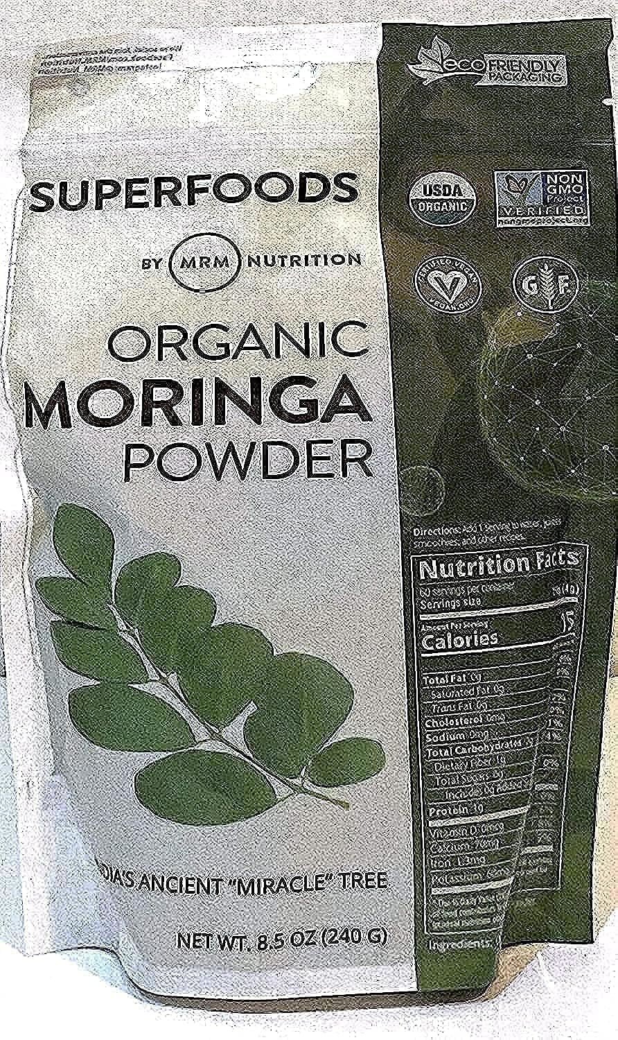 MRM Nutrition Moringa Powder is a nutrient-dense, high-protein, and high-fiber whole leaf powder. It contains essential amino acids, calcium, and potassium, supporting bone density and electrolyte balance. USDA Organic, Non-GMO, and Vegan certified, it is ideal for smoothies, yogurts, and cereals. Key Features USDA Organic certified Non-GMO Project Verified Vegan and Gluten-Free Supports lean muscle maintenance Promotes digestive health High protein and high fiber Contains essential amino acids Rich in calcium and potassium Used in Ayurvedic medicine Organic Moringa Leaf Powder.MRM Nutrition: Inspired by nature, utilizing science for natural health products.Add 1 serving to water, juices, smoothies, and other recipes.Consuming this product can expose you to chemicals including lead, which are known to the State of California to cause birth defects or other reproductive harm. For more information, go to www.P65Warnings.ca.gov/food.