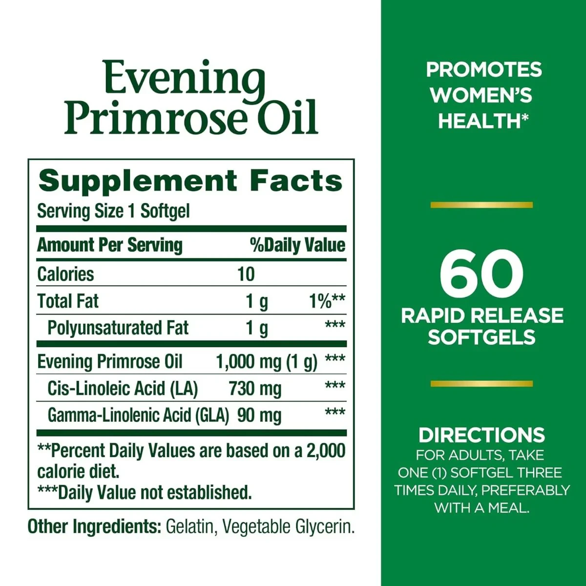 Natures Bounty Evening Primrose Oil 1000mg 60 SoftgelEvening Primrose Oil (rich in Gamma-Linolenic Acid - GLA)Evening primrose oil providing 1000mg per softgel, a natural source of GLA (gamma-linolenic acid) to support hormonal balance, skin health, and overall wellness. Includes 60 softgels.As labelled or as directed by healthcare practionerDo not exceed the recommended dose or as advised by health care practioner