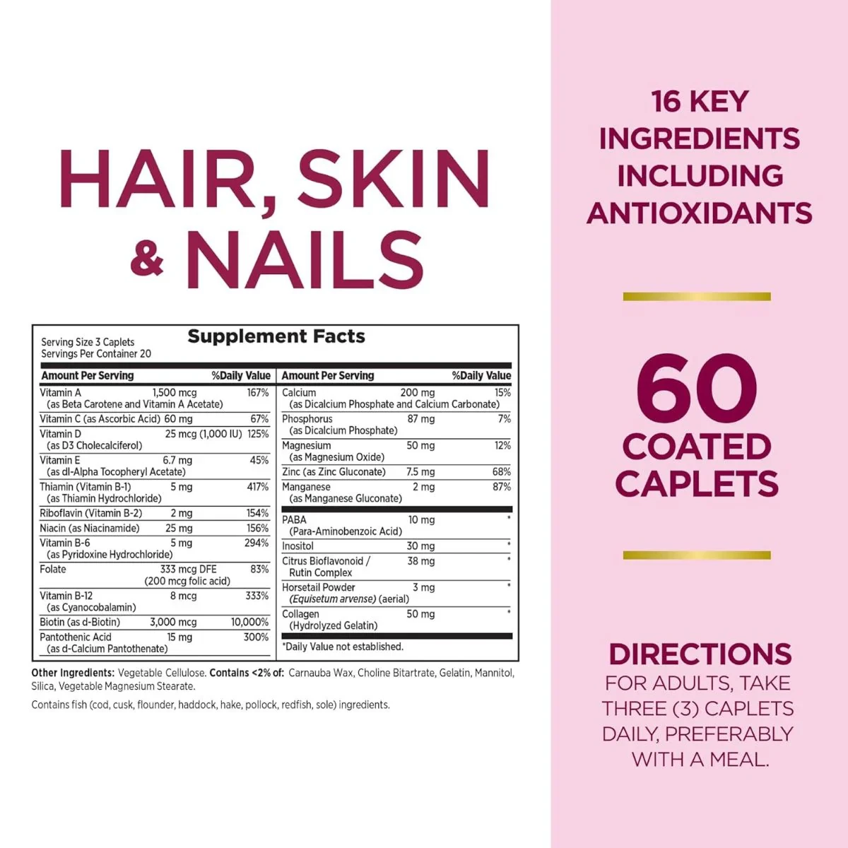 Natures Bounty Skin Hair & Nails 60 Tabletsbiotin, vitamins A, C, E, B-complex, collagen, and mineralsFormulated with biotin and essential nutrients to support healthy skin, hair, and nails. Comes in a bottle of 60 tablets.As labelled or as directed by healthcare practionerDo not exceed the recommended dose or as advised by health care practioner