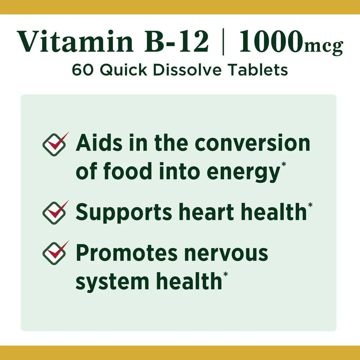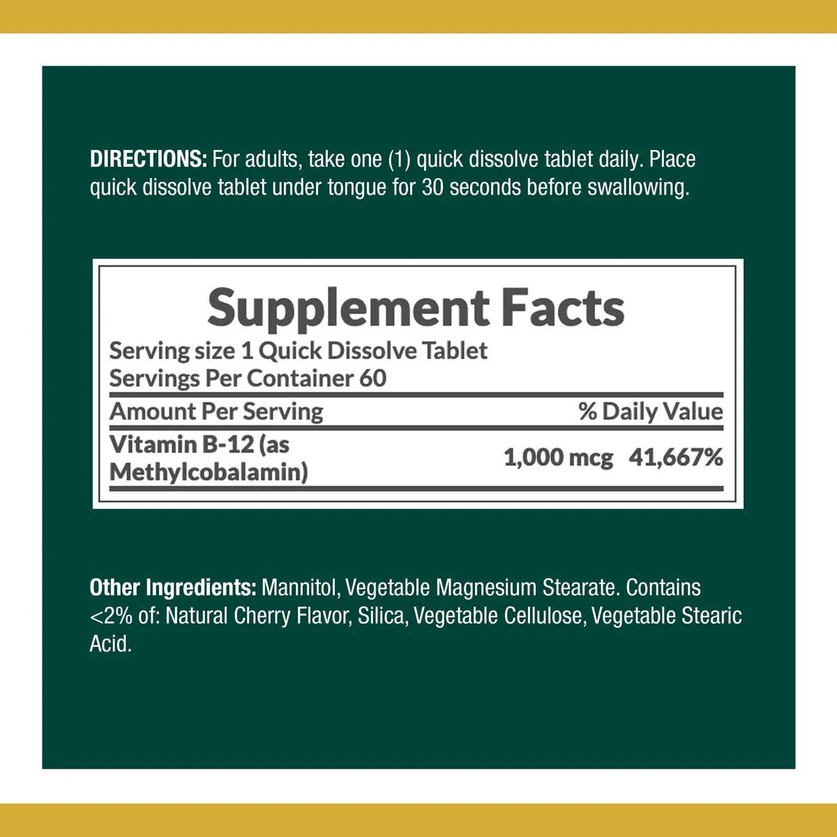 Nature's Bounty Vitamin B12 Methylcobalamin 1000mcg Quick Dissolve Tablets support energy metabolism, heart, and nervous system health. Each serving delivers 1000 mcg of Methylcobalamin, aiding in the conversion of food into cellular energy. The tablets are non-GMO, gluten-free, and suitable for vegetarians, with a natural cherry flavor. Features Aids in the conversion of food into energy Supports heart health Promotes nervous system health Quick dissolve tablets Natural cherry flavor Suitable for vegetarians Non-GMO Gluten-free Vitamin B-12 (as Methylcobalamin), Mannitol, Vegetable Magnesium Stearate, Natural Cherry Flavor, Silica, Vegetable Cellulose, Vegetable Stearic Acid.Leading provider of vitamins and supplements, known for trusted quality and pure ingredients.Take one quick dissolve tablet daily. Place under tongue for 30 seconds before swallowing.Consult a doctor before use if pregnant, nursing, taking medications, or having medical conditions. Discontinue use and consult a doctor if adverse reactions occur. Keep out of reach of children. Store at room temperature and do not use if the seal under the cap is broken or missing.
