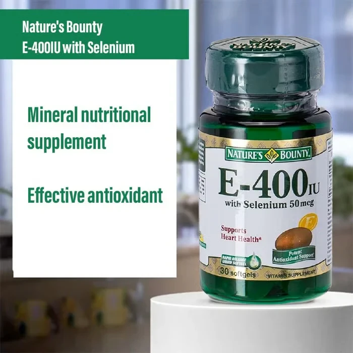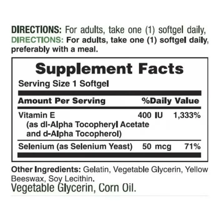 Natures Bounty Vitamin E 400IU 50mcg With Selenium 30 SoftgelVitamin E (d-Alpha Tocopherol), Selenium (in combo)This product combines 400IU of Vitamin E with 50mcg of Selenium for dual antioxidant support, in a pack of 30 softgels.As labelled or as directed by healthcare practionerDo not exceed the recommended dose or as advised by health care practioner