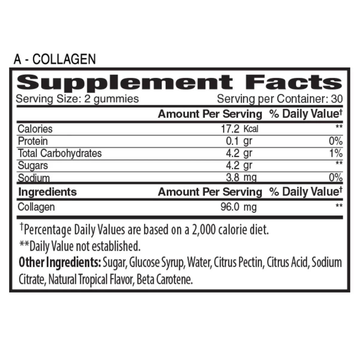 The Gummies Co. Adults Collagen Gummies are designed to support overall health, focusing on hair, skin, nails, joints, and bones. Made with natural ingredients, these vegan-friendly gummies are free from artificial colors and flavors, and are gluten and gelatin-free. Ideal for daily use, they help maintain healthy cartilage and connective tissues. Key Features Promotes joint health Supports hair, skin, nails, joints, and bone health Gluten-free and gelatin-free Vegan-approved Natural tropical fruit flavor Allergen-free and halal approved Contains natural ingredients Super strength formula Collagen, Sugar, Glucose Syrup, Water, Citrus Pectin, Citrus Acid, Sodium Citrate, Natural Tropical Flavor, Beta Carotene.The Gummies Co. specializes in natural, vegan-friendly gummy vitamins, promoting health and wellness with innovative formulas.Take 1 serving (2 gummies) daily, with a maximum of 8 gummies within a 24-hour period.Keep out of reach of children.