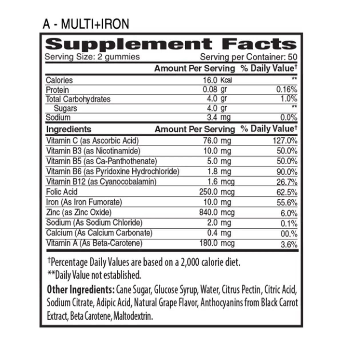 Vitamin C (as Ascorbic Acid), Vitamin B3 (as Nicotinamide), Vitamin B5 (as Ca-Panthothenate), Vitamin B6 (as Pyridoxine Hydrochloride), Vitamin B12 (as Cyanocobalamin), Folic Acid, Iron (As Iron Fumorate), Zinc (as Zinc Oxide), Sodium (As Sodium Chloride), Calcium (As Calcium Carbonate), Vitamin A (As Beta-Carotene), Cane Sugar, Glucose Syrup, Water, Citrus Pectin, Citric Acid, Sodium Citrate, Adipic Acid, Natural Grape Flavor, Anthocyanins from Black Carrot Extract, Beta Carotene, Maltodextrin.Specialists in delicious and nutritious gummy vitamins for adults.Take 2 gummies daily.IRON WARNING: Accidental overdose of iron-containing products is a leading cause of fatal poisoning in children under 6 years. Keep this product out of reach of children. If overdose occurs, call a doctor or poison control center immediately.