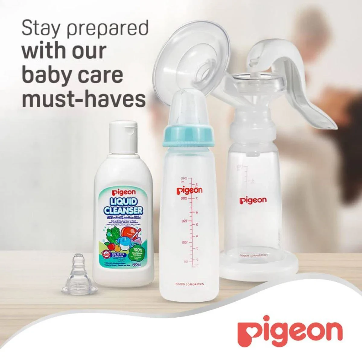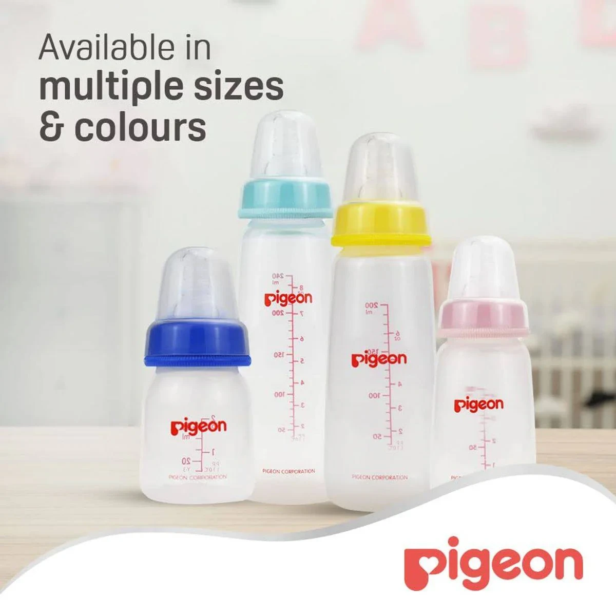 The Pigeon Plastic Feeding Bottle with Transparent Cap is designed for easy and safe feeding. Made from BPA and BPS free materials, it features an ultra-soft silicone nipple that mimics breastfeeding, promoting healthy oral development. The anti-colic bottle ensures smooth milk flow and reduces gas and fussiness, making it ideal for daily use. Key Features Air Ventilation System for smooth milk flow Easy to store and clean with slim neck design BPA & BPS Free for toxin-free safety Ultra-soft silicone nipple mimics breastfeeding Durable and comfortable thick nipple Ergonomic shape for easy grip Key Materials: Bottle: Polypropylene (PP) plastic; Nipple: Silicone.Experts in baby care essentials and innovative feeding solutions.Preparation: Clean and sterilize before first use and after each use. Feeding: Fill with formula/milk and attach the teat. Check temperature before feeding.Inspect bottle and nipple regularly. Never warm milk in the microwave (scalding hazard). Use under adult supervision.