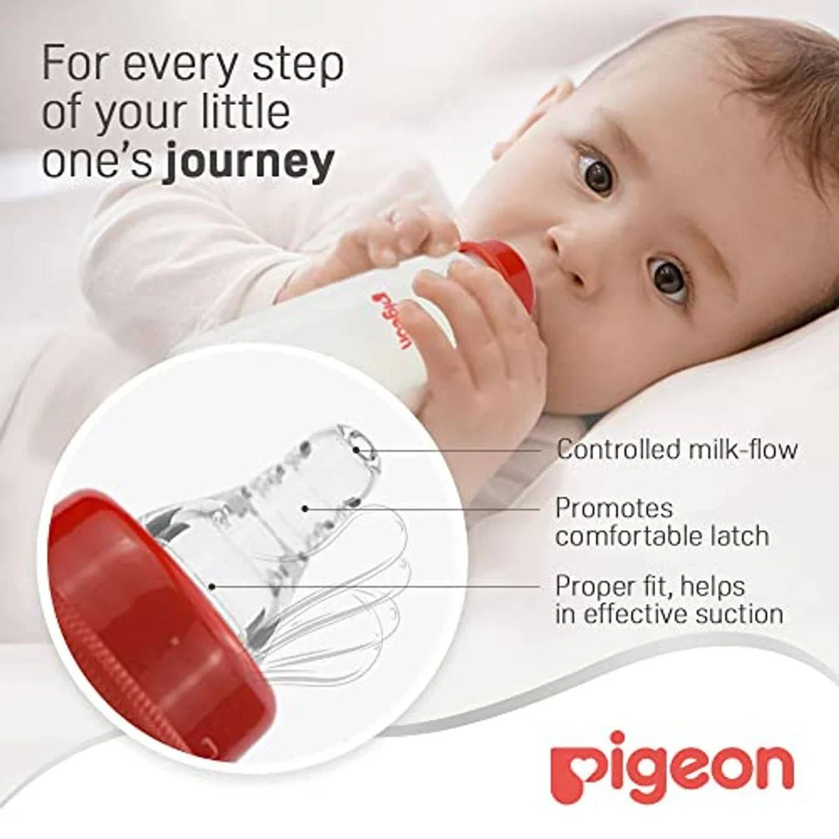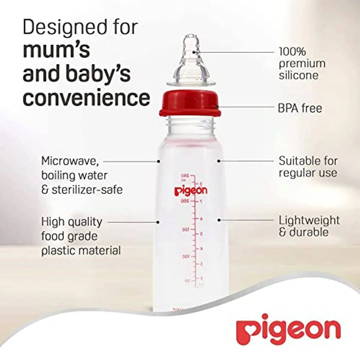 The Pigeon Plastic Feeding Bottle is designed to support your baby’s natural feeding motion. It features an ultra-soft silicone nipple and an anti-colic system to prevent gas and swallowed air. The bottle is BPA-free and easy to clean, making it a reliable choice for busy parents. Key Features Traditional sleek shape Controlled milk flow Anti-Colic System 100% premium silicone BPA free Microwave and sterilizer-safe Lightweight and durable Air Ventilation System Key Materials: Bottle: Polypropylene (PP) plastic (BPA/BPS Free); Nipple: Silicone.Experts in baby care essentials and innovative feeding solutions.Use To Feed Liquids To Infants, Ensuring Easy And Comfortable Feeding.Bpa Free.