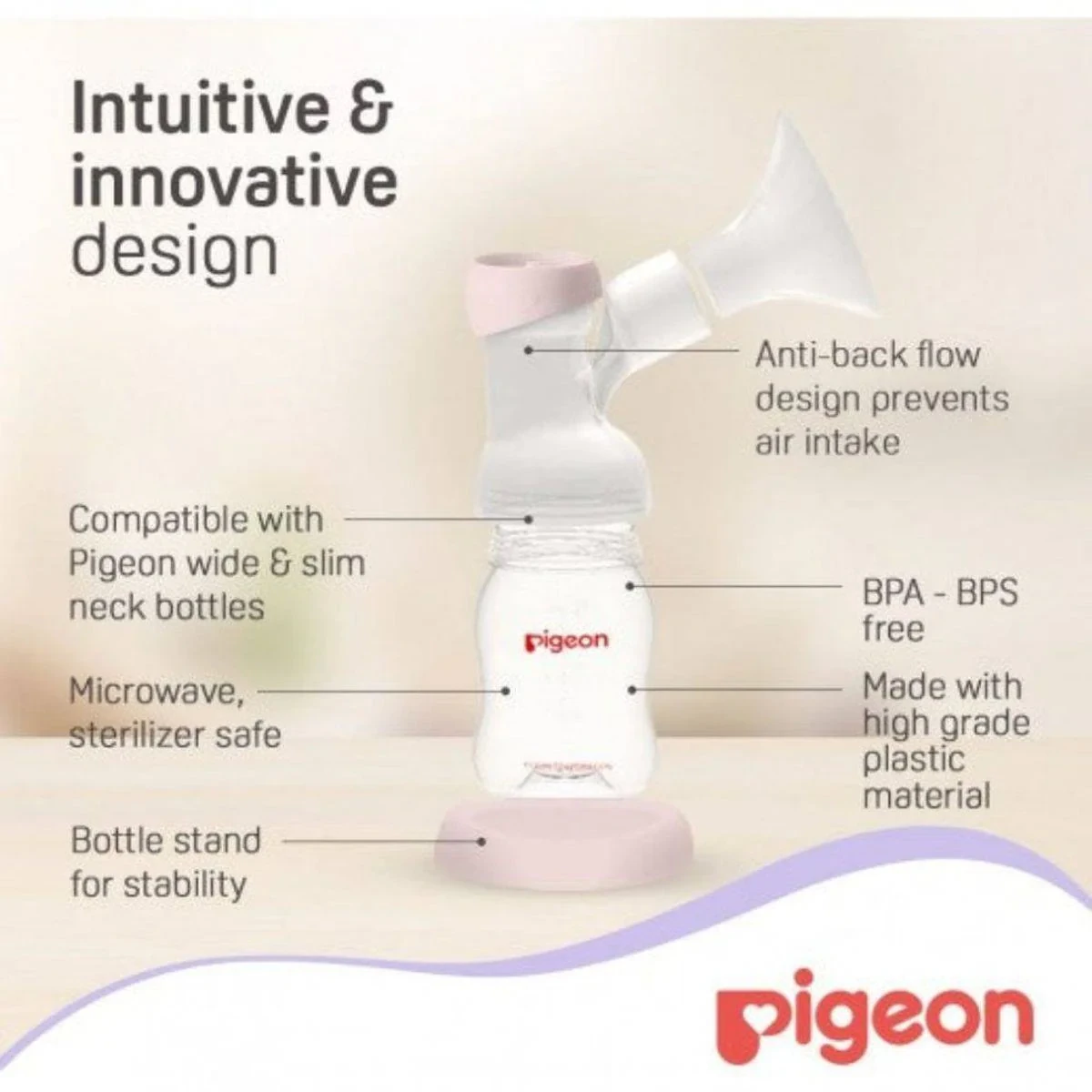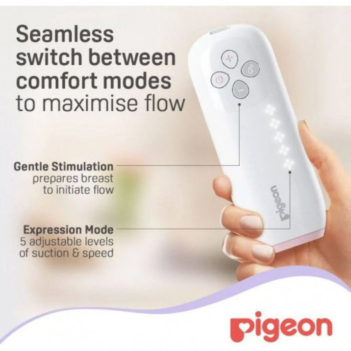 The Pigeon Go Mini Electric Breast Pump is the smallest and lightest in its class, designed for convenience and portability. It features an anti-backflow design to prevent air intake and is made with high-grade plastic material. BPA and BPS free, it is compatible with Pigeon wide and slim neck bottles. Features Intuitive & innovative design Compatible with Pigeon wide & slim neck bottles Microwave, sterilizer safe Bottle stand for stability Anti-backflow design prevents air intake BPA-BPS free Made with high-grade plastic material Seamless switch between comfort modes Gentle stimulation prepares breast to initiate flow Expression mode with 5 adjustable levels of suction & speed Key Materials: Electric motor (plastic/electronic components); Silicone shield/diaphragm; Plastic collection bottle (PP).Experts in baby care essentials known for innovative and safe products.Seamless Switch Between Comfort Modes To Maximise Flow. Gentle Stimulation Prepares Breast To Initiate Flow. Expression Mode With 5 Adjustable Levels Of Suction & Speed.Electric Device: Keep motor unit dry. Do not wash tubing. Use only as intended. Inspect all parts before use.