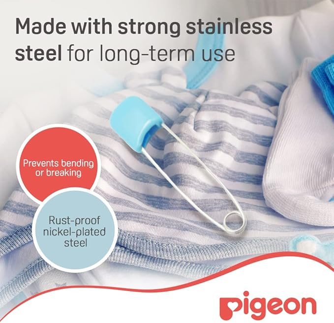 Pigeon Safety Pins are made from durable stainless steel, featuring a secure locking mechanism and smooth tips to protect delicate fabrics and skin. Ideal for fastening baby clothes and nappies. Features Secure locking mechanism Durable stainless steel Smooth rounded tips Large size for thicker fabrics Assorted colors Not SpecifiedExperts in baby care essentials