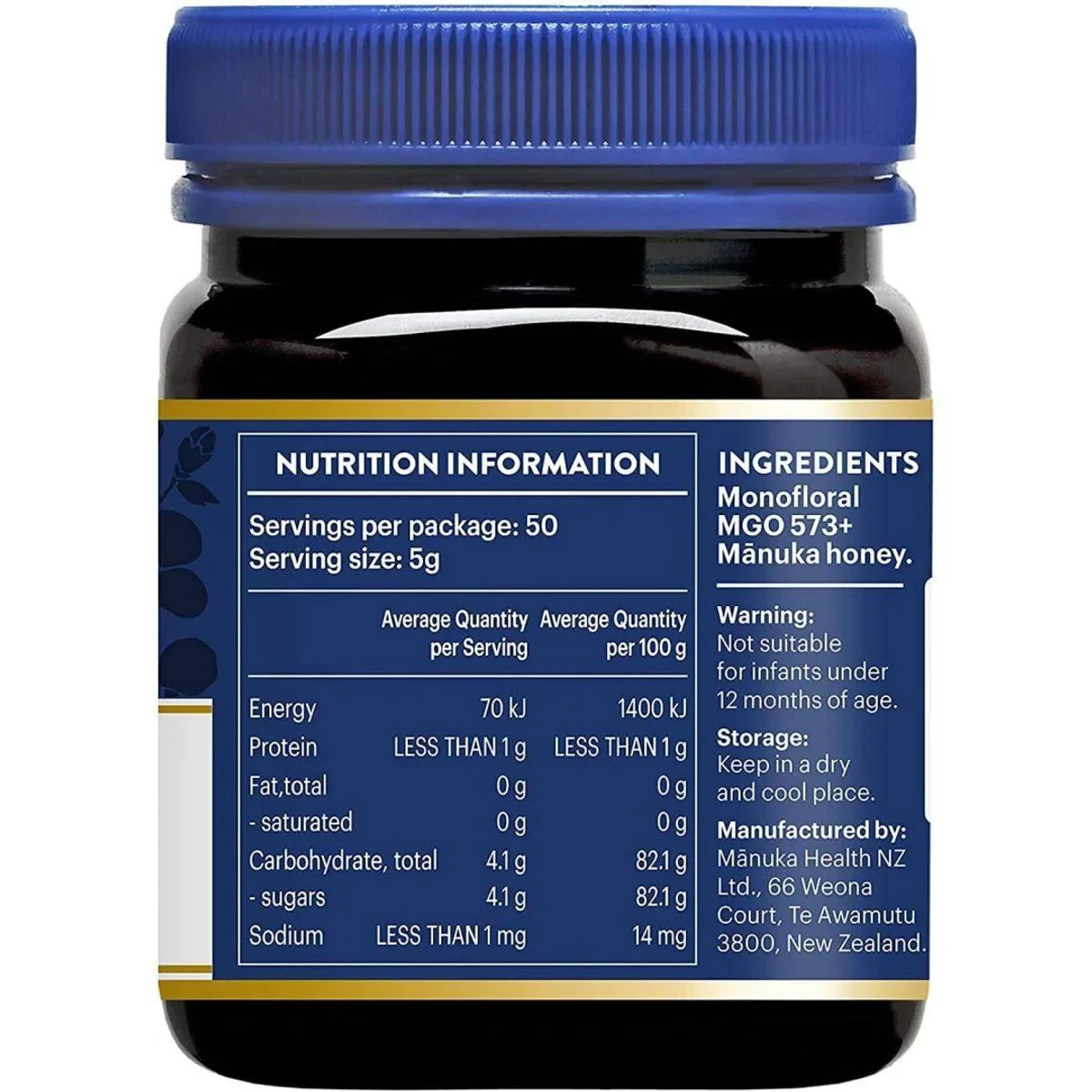 This premium M?nuka honey is renowned for its high MGO content, offering natural wellness benefits. Harvested in New Zealand, it is ideal for enhancing daily health routines. Key Features Monofloral M?nuka honey MGO 573+ rating UMF 16+ certified Not suitable for infants under 12 months Monofloral MGO573+ M?nuka honey.Manuka Health: Pioneers in premium M?nuka honey from New Zealand.Consume straight from the spoon (typically 1 teaspoon daily). Can be added to water, tea, or smoothies.Not suitable for infants under 12 months of age.